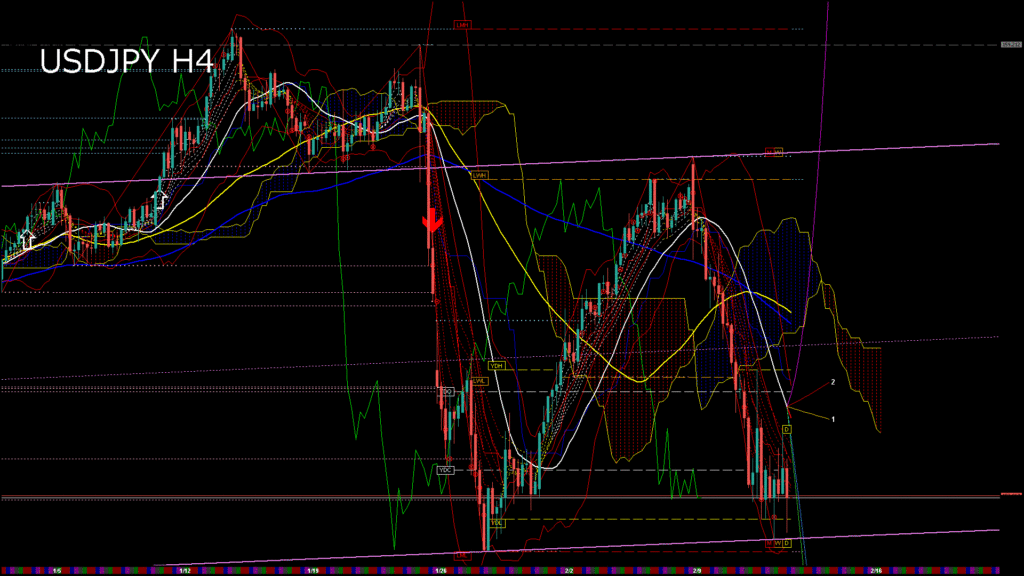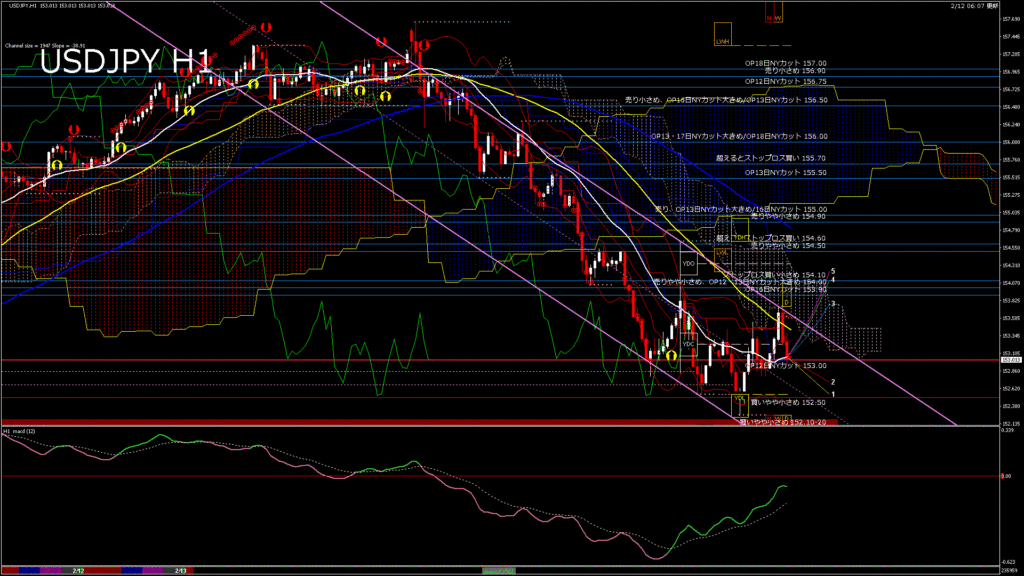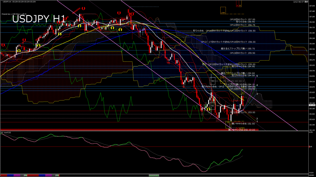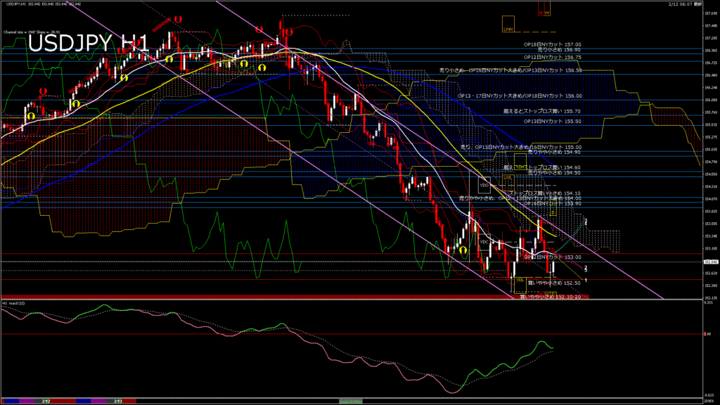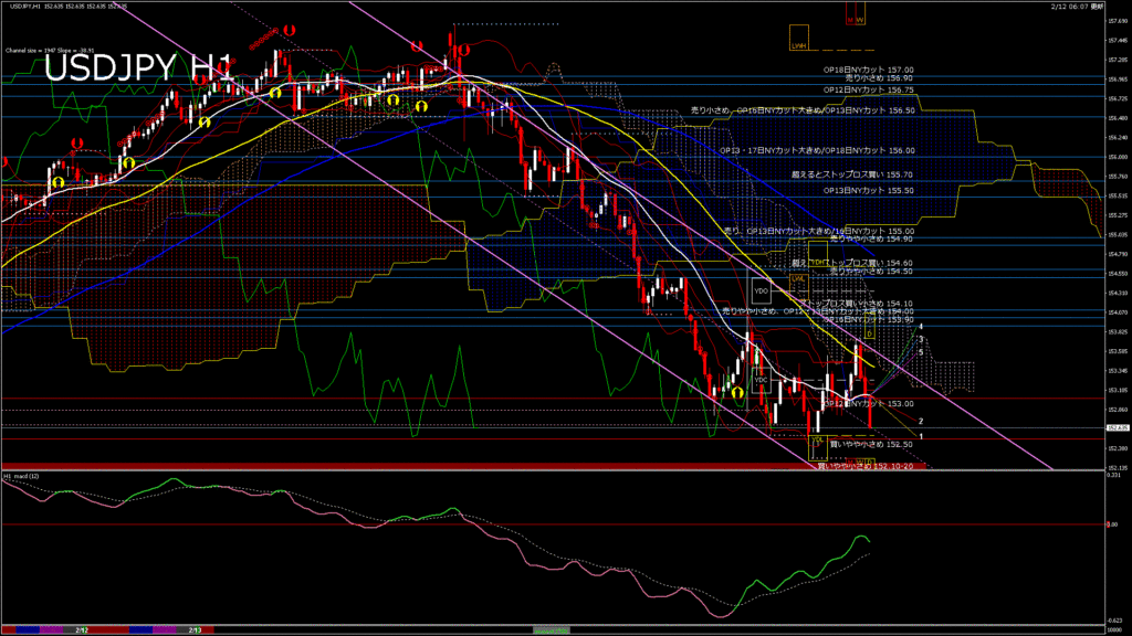 情報 USDJPY-H1移動平均線と現在値(RSI)-2026.2.13 6:00:00