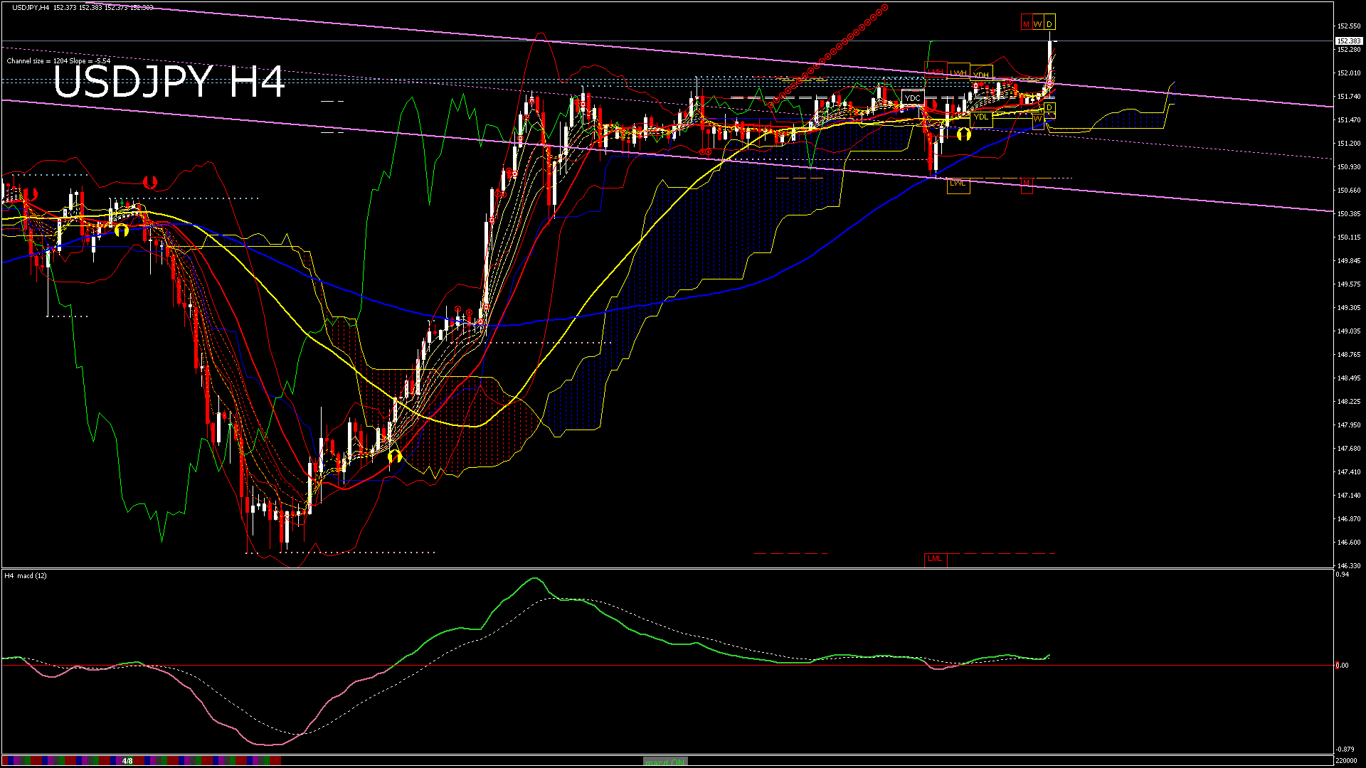USDJPY-H4移動平均線と現在値(RSI)-2024.4.10 22:00:00