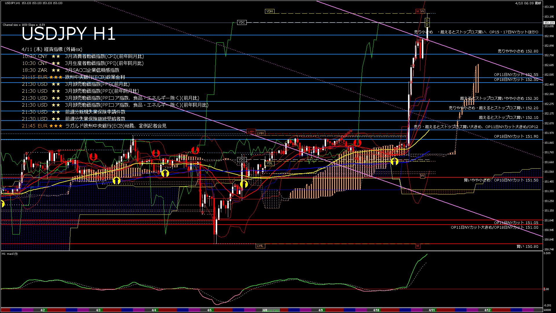 USDJPY-H1移動平均線と現在値(RSI)-2024.4.11 6:00:00