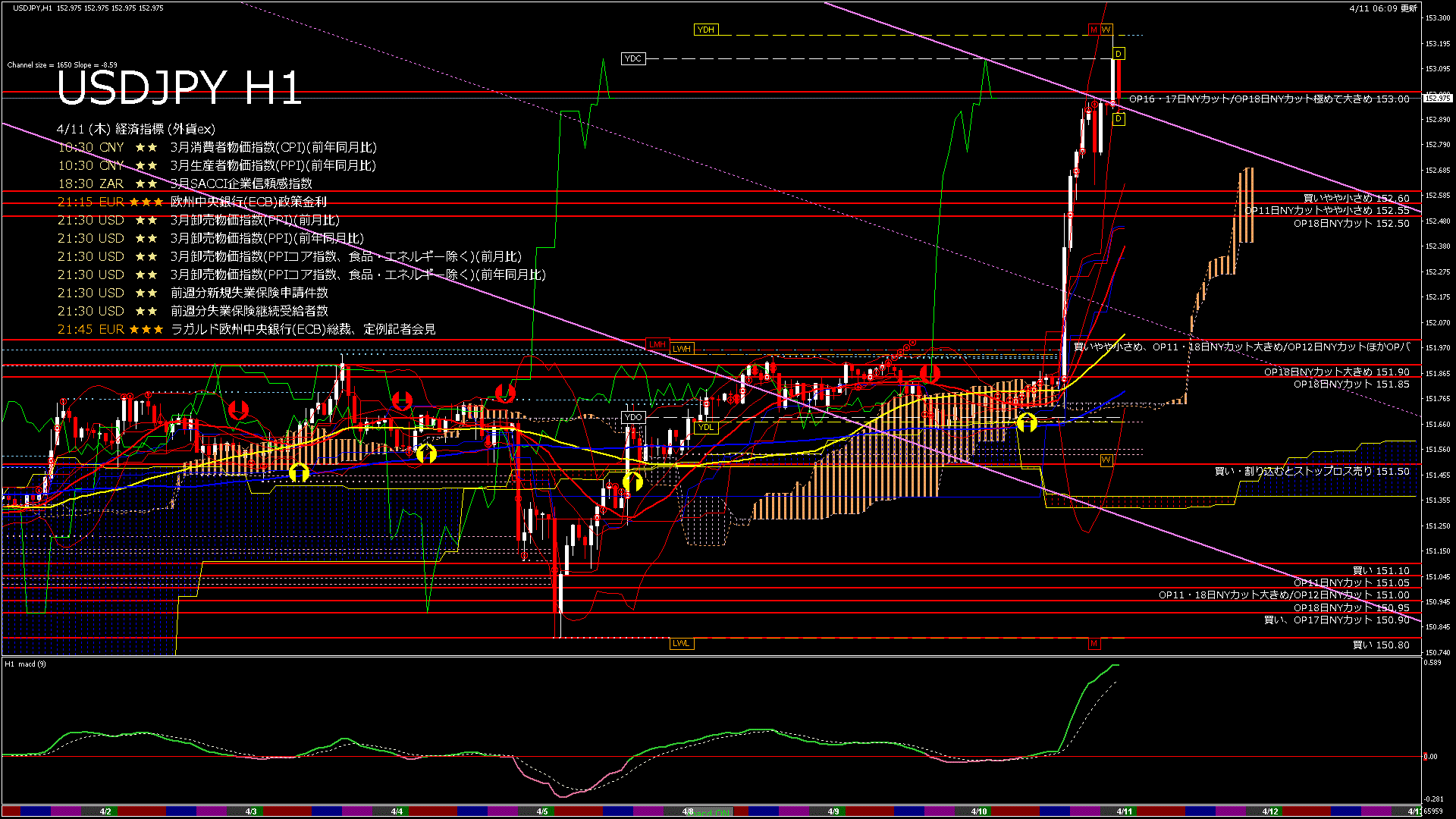 USDJPY-H1移動平均線と現在値(RSI)-2024.4.11 7:00:07