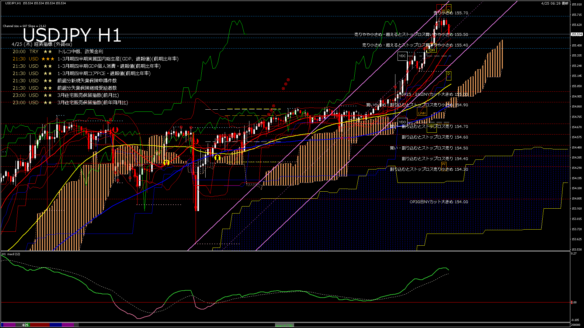USDJPY-H1移動平均線と現在値(RSI)-2024.4.25 21:00:05