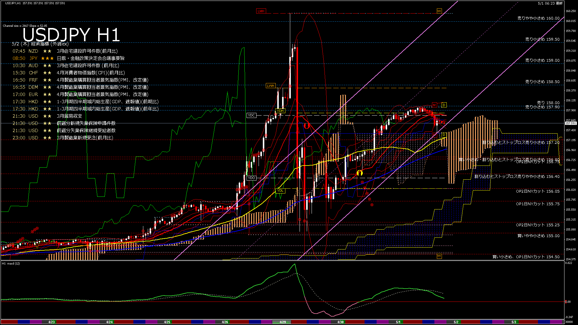 USDJPY-H1移動平均線と現在値(RSI)-2024.5.2 2:00:00