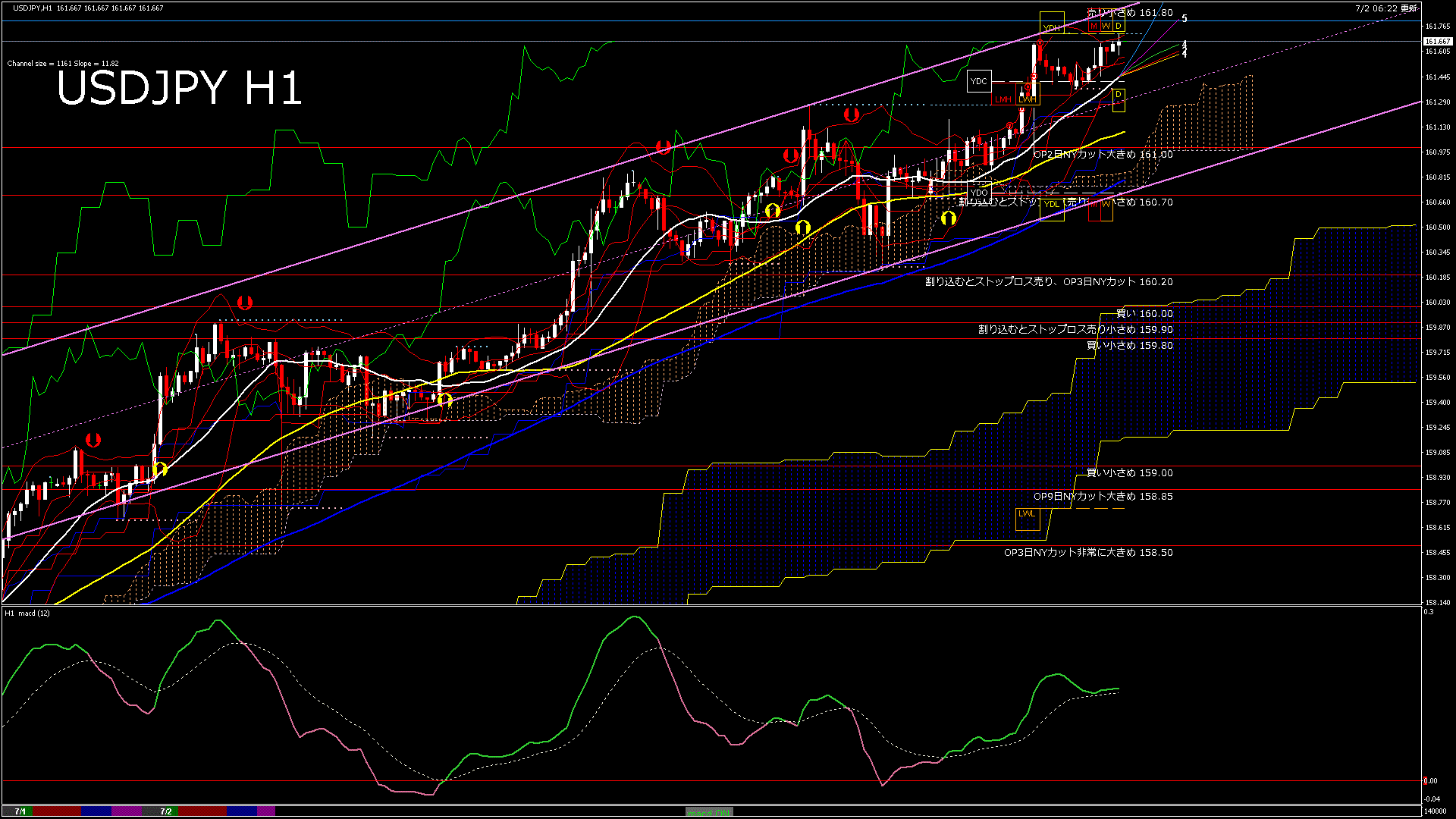 USDJPY-H1移動平均線と現在値(RSI)-2024.7.2 14:00:00