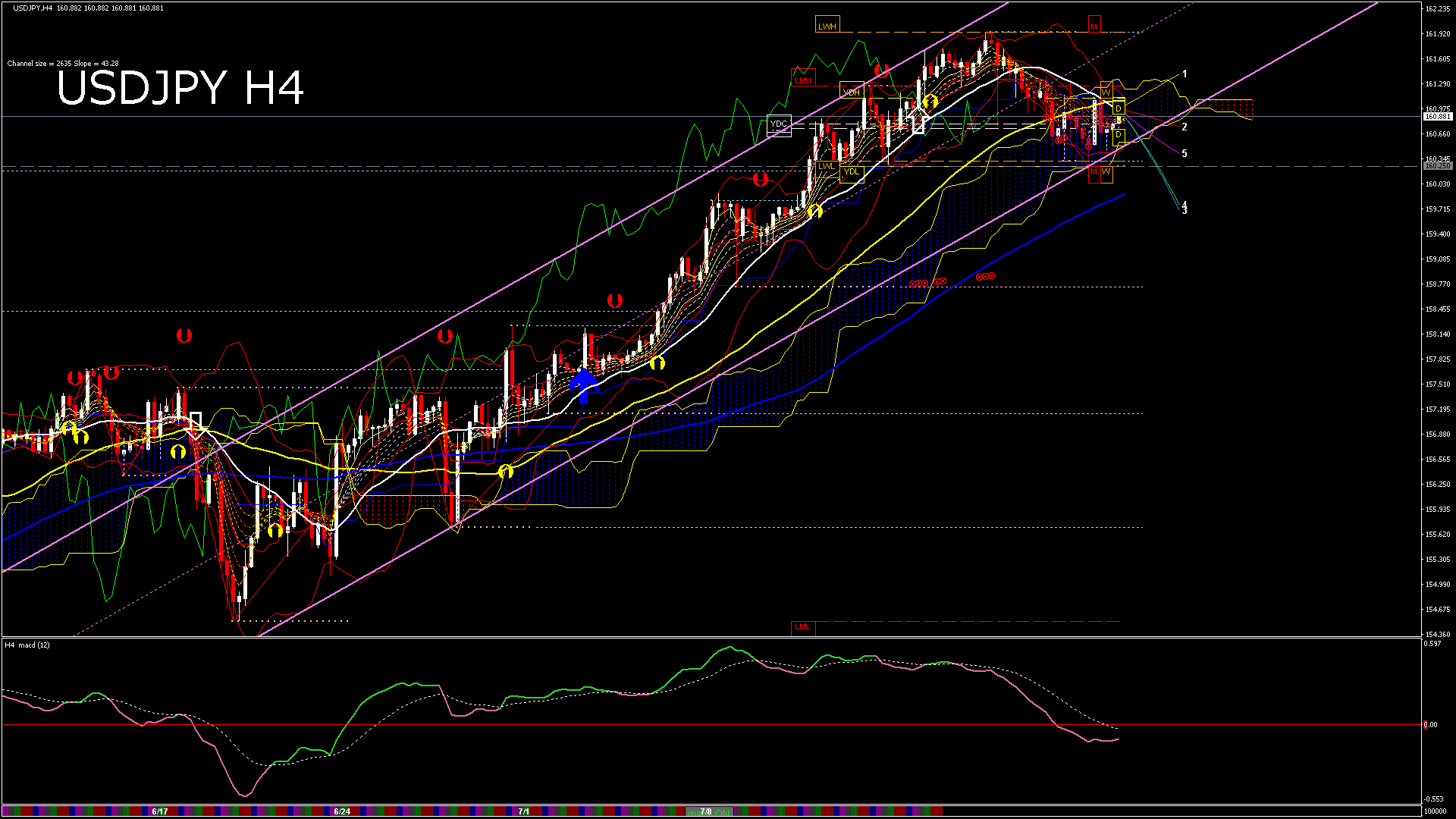 USDJPY-H4移動平均線と現在値(RSI)-2024.7.9 10:00:02