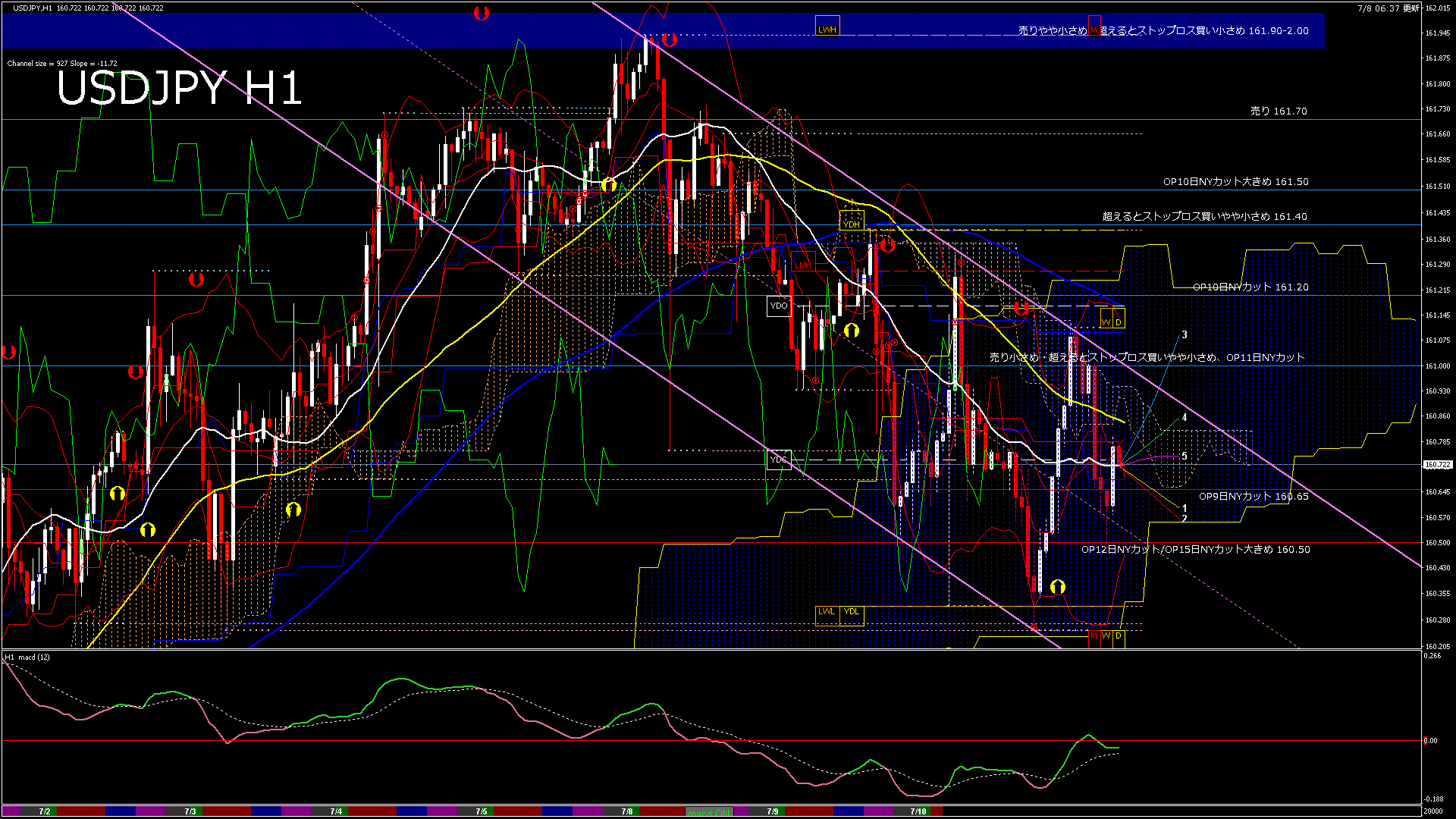 USDJPY-H4移動平均線と現在値(RSI)-2024.7.9 2:00:00