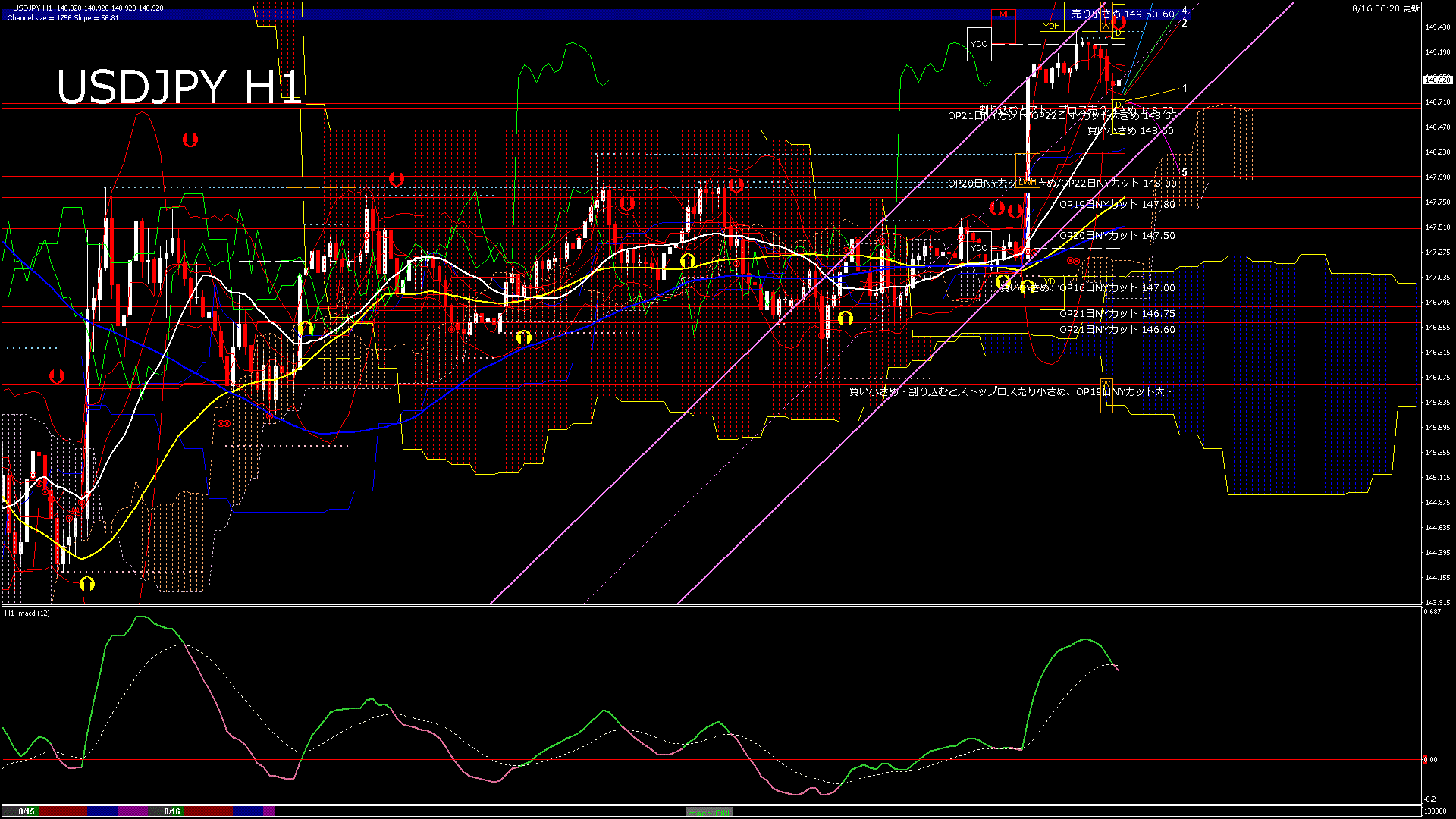 USDJPY-H1移動平均線と現在値(RSI)-2024.8.16 13:00:00