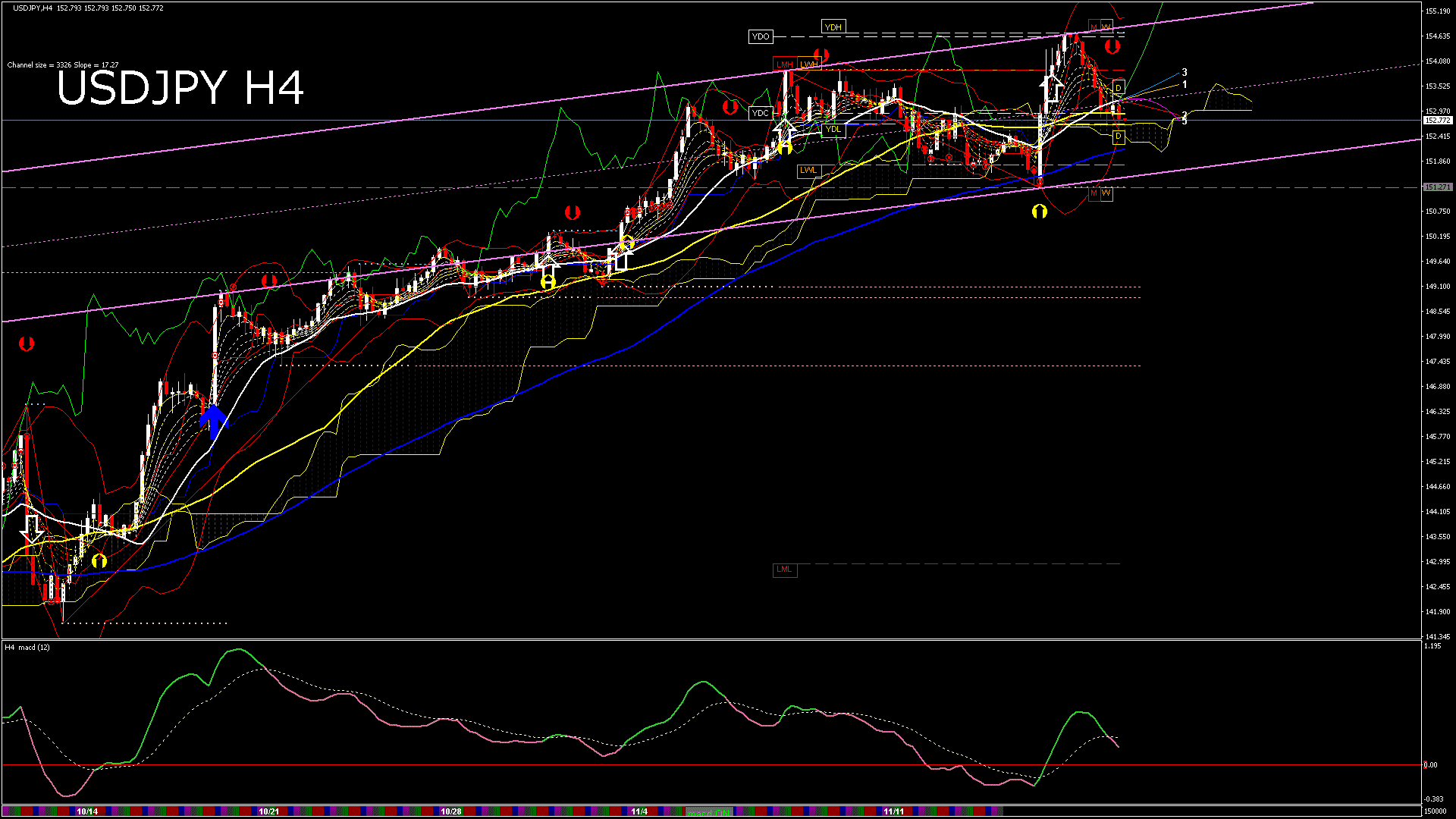 USDJPY-H4移動平均線と現在値(RSI)-2024.11.8 19:00:03