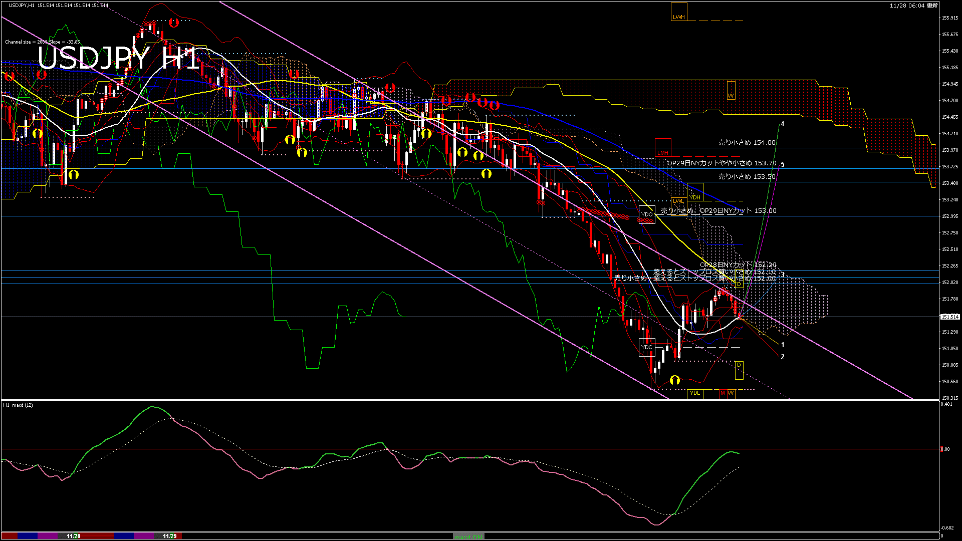 USDJPY-H1移動平均線と現在値(RSI)-2024.11.29 0:00:00