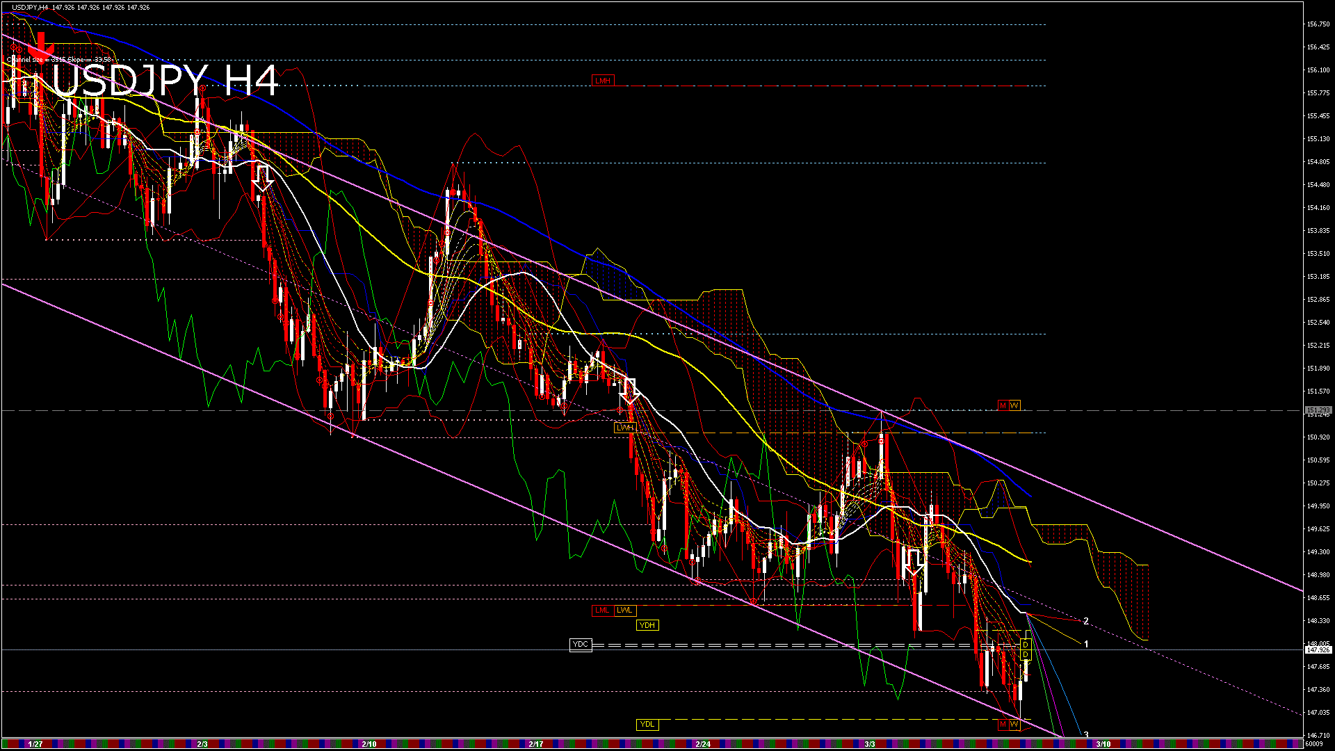 USDJPY-H4移動平均線と現在値(RSI)-2025.3.10 7:00:06