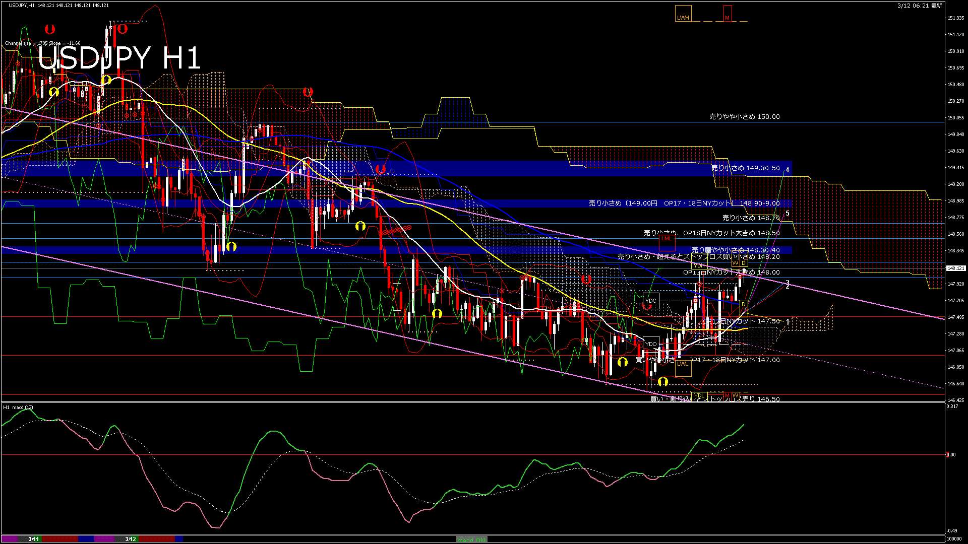 USDJPY-H1移動平均線と現在値(RSI)-2025.3.12 10:00:00