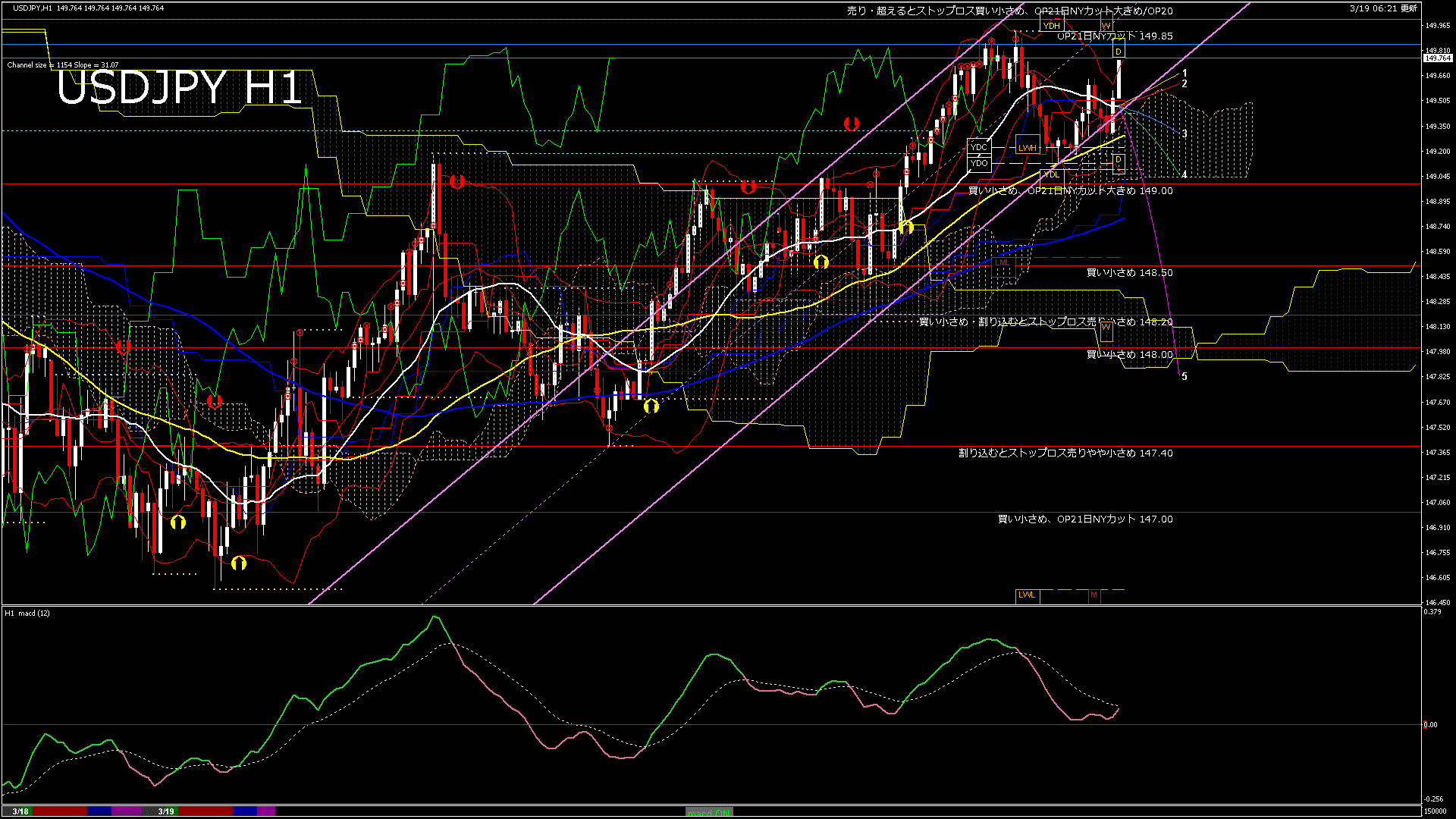 USDJPY-H4移動平均線と現在値(RSI)-2025.3.19 15:00:06