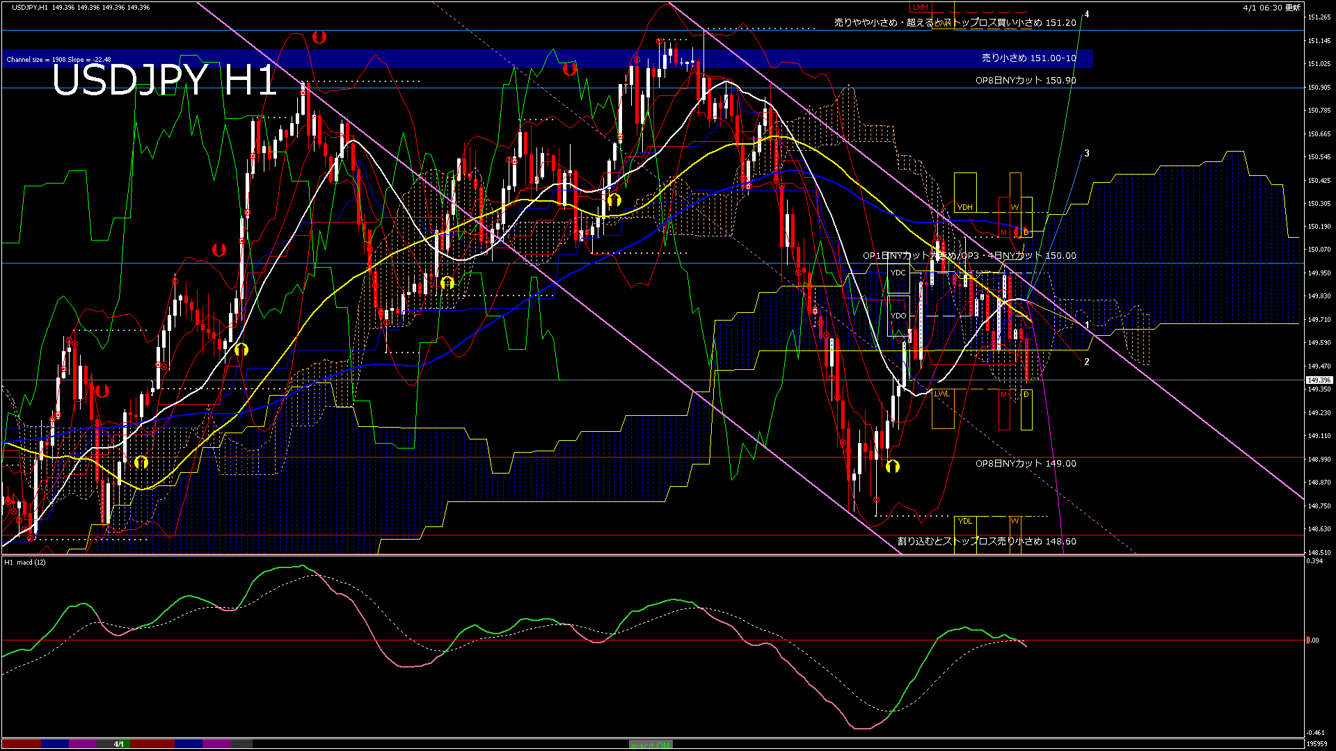 USDJPY-H1移動平均線と現在値(RSI)-2025.4.1 21:00:00