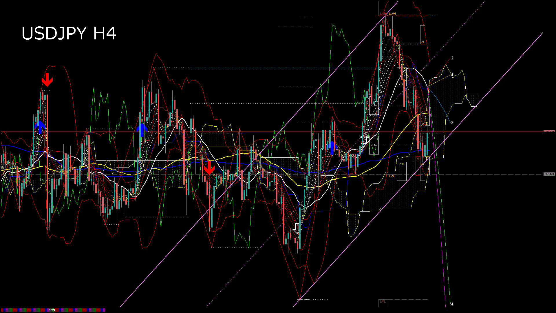 USDJPY-H4移動平均線と現在値(RSI)-2025.10.1 14:00:07