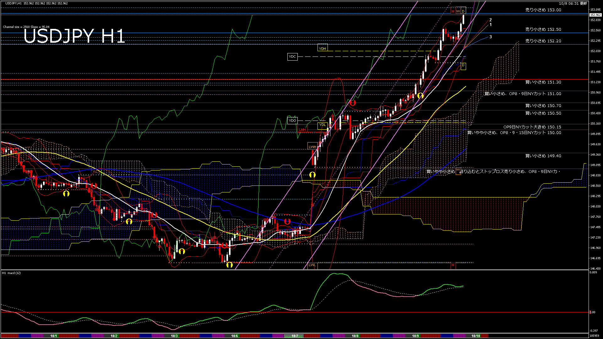 USDJPY-H1移動平均線と現在値(RSI)-2025.10.8 18:00:00
