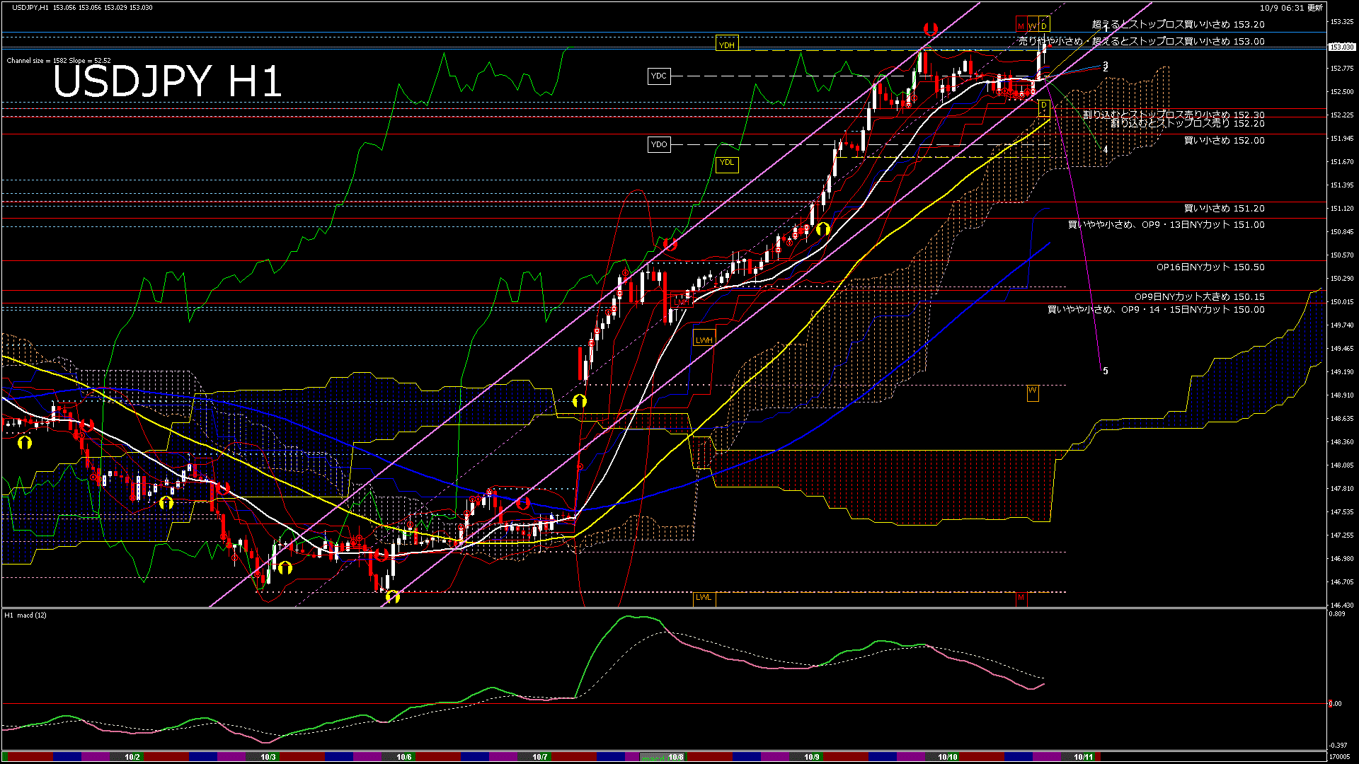 USDJPY-H1移動平均線と現在値(RSI)-2025.10.9 16:00:00