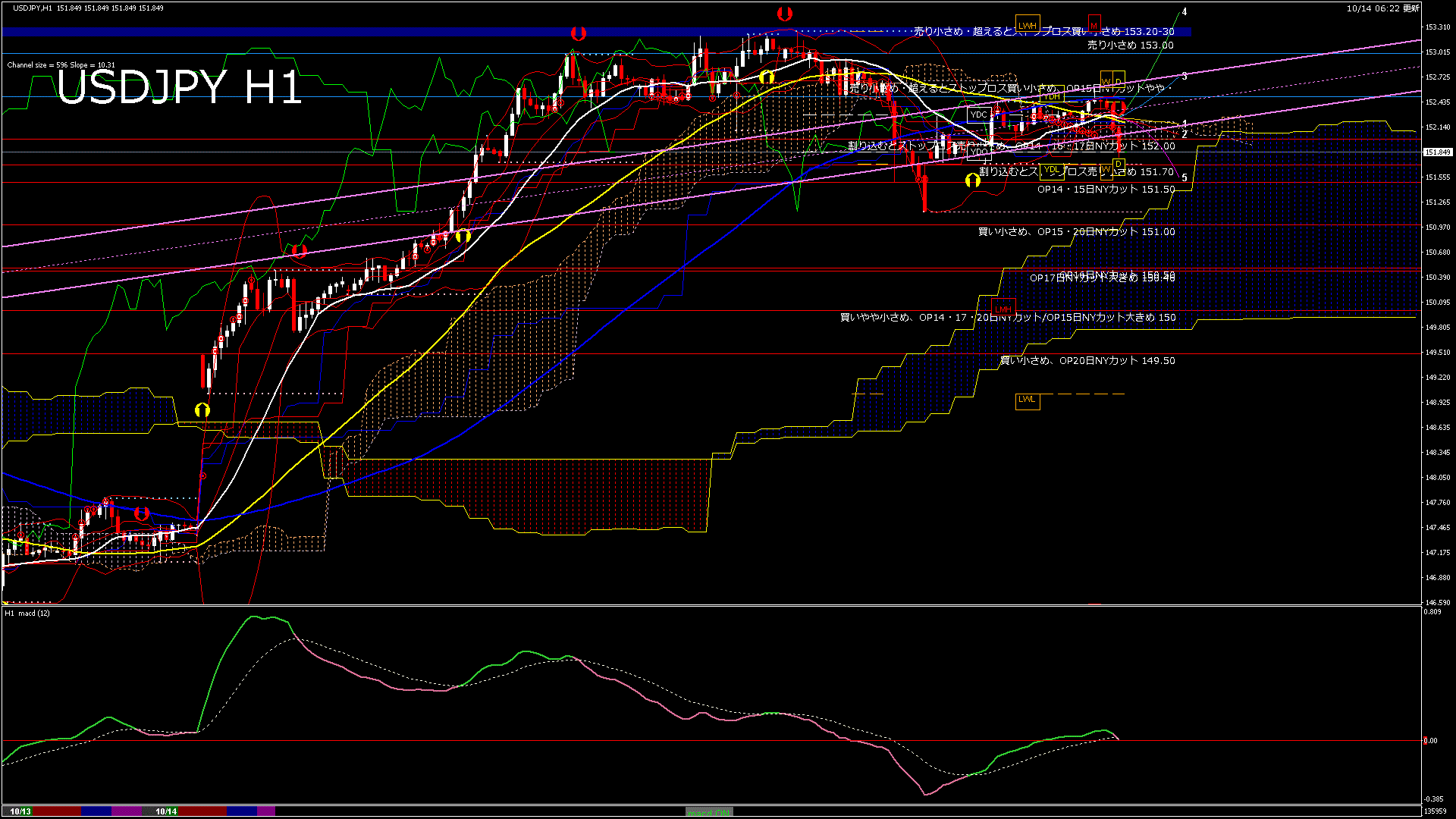USDJPY-H1移動平均線と現在値(RSI)-2025.10.14 13:00:00