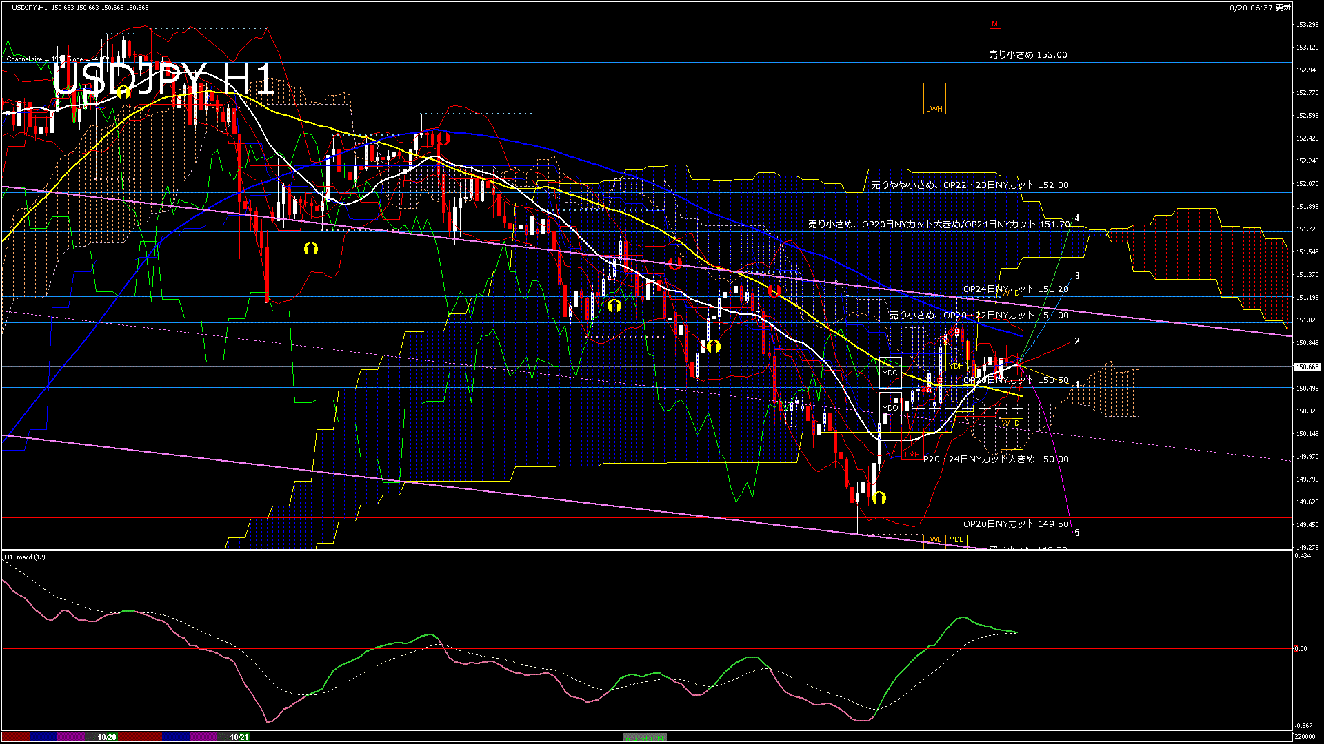 USDJPY-H1移動平均線と現在値(RSI)-2025.10.20 21:00:00