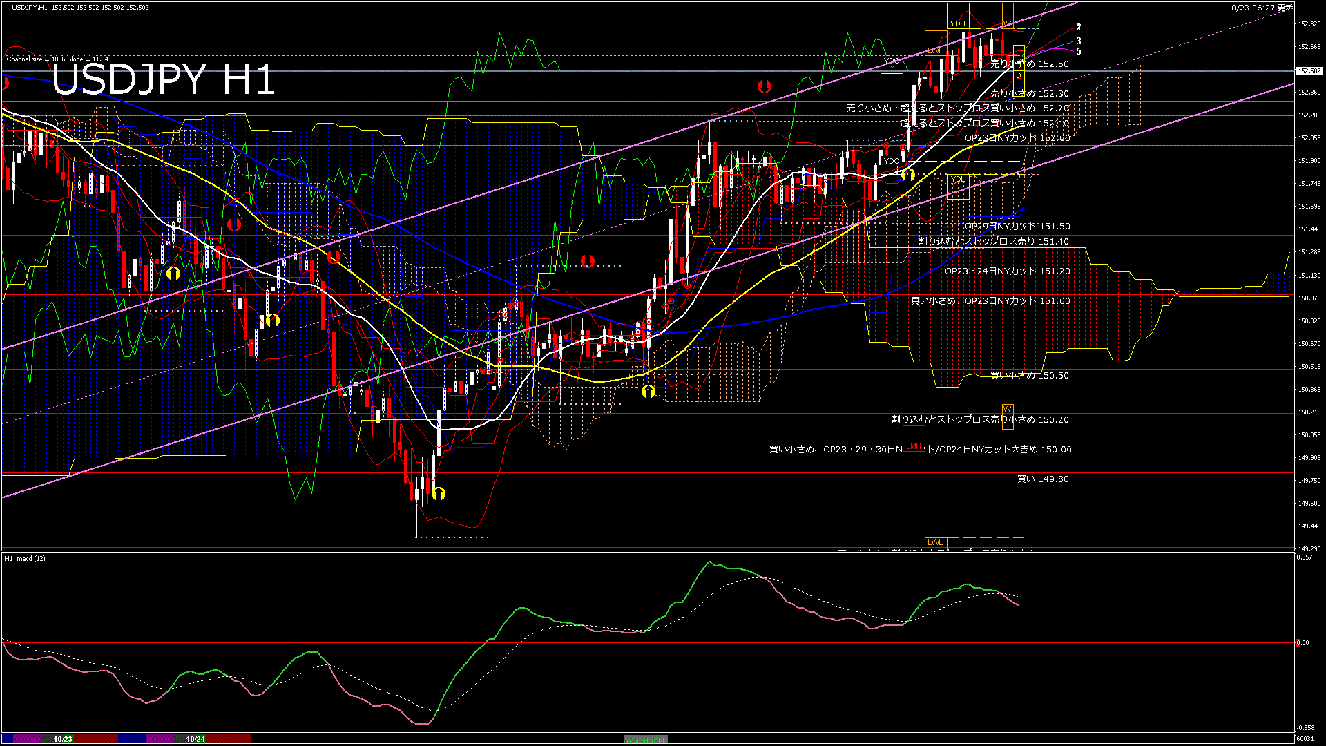 USDJPY-本日の経済指標と日足移動平均線(RSI)-2025.10.24 6:00:30