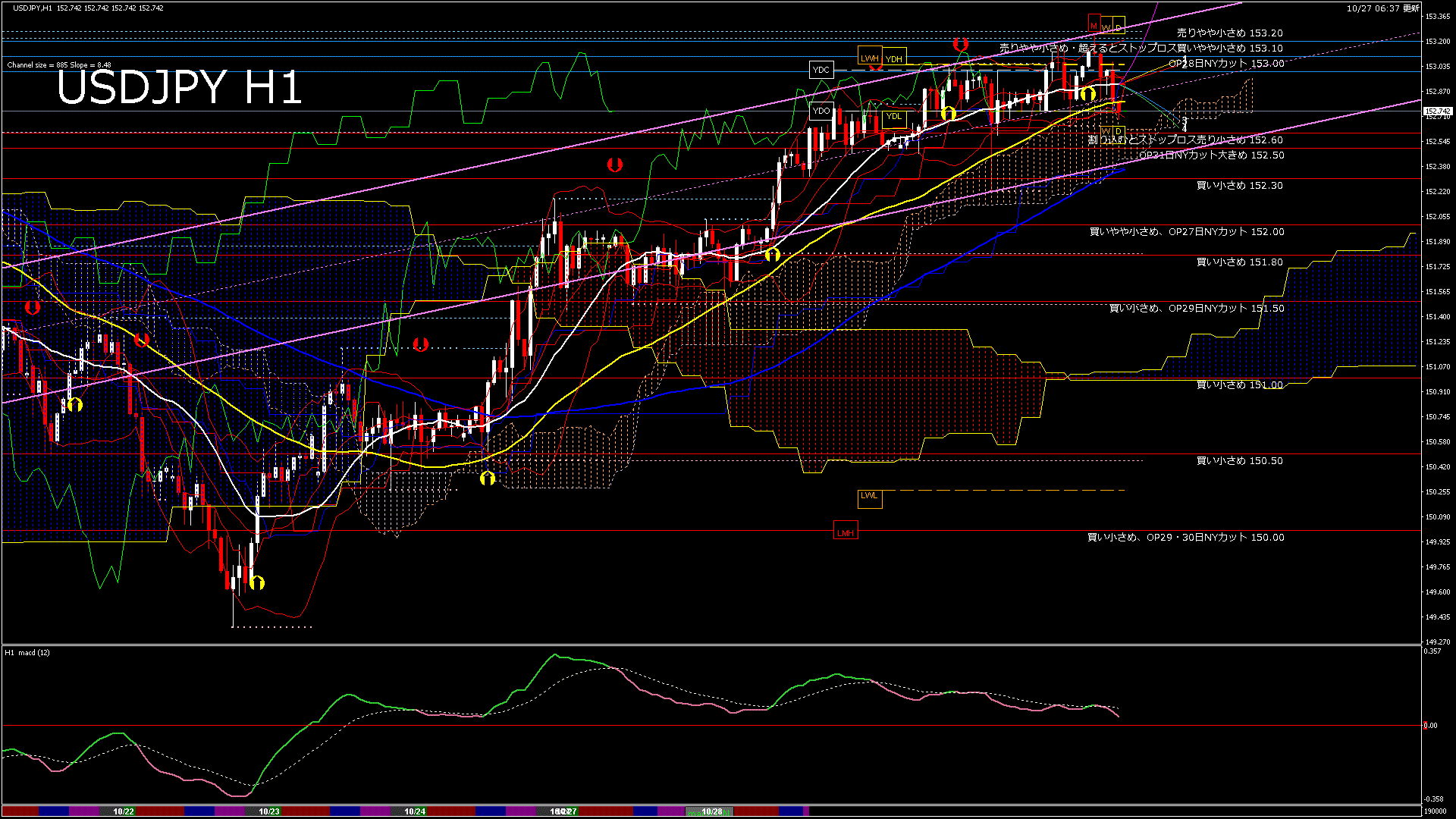 USDJPY-H1移動平均線と現在値(RSI)-2025.10.27 18:00:00