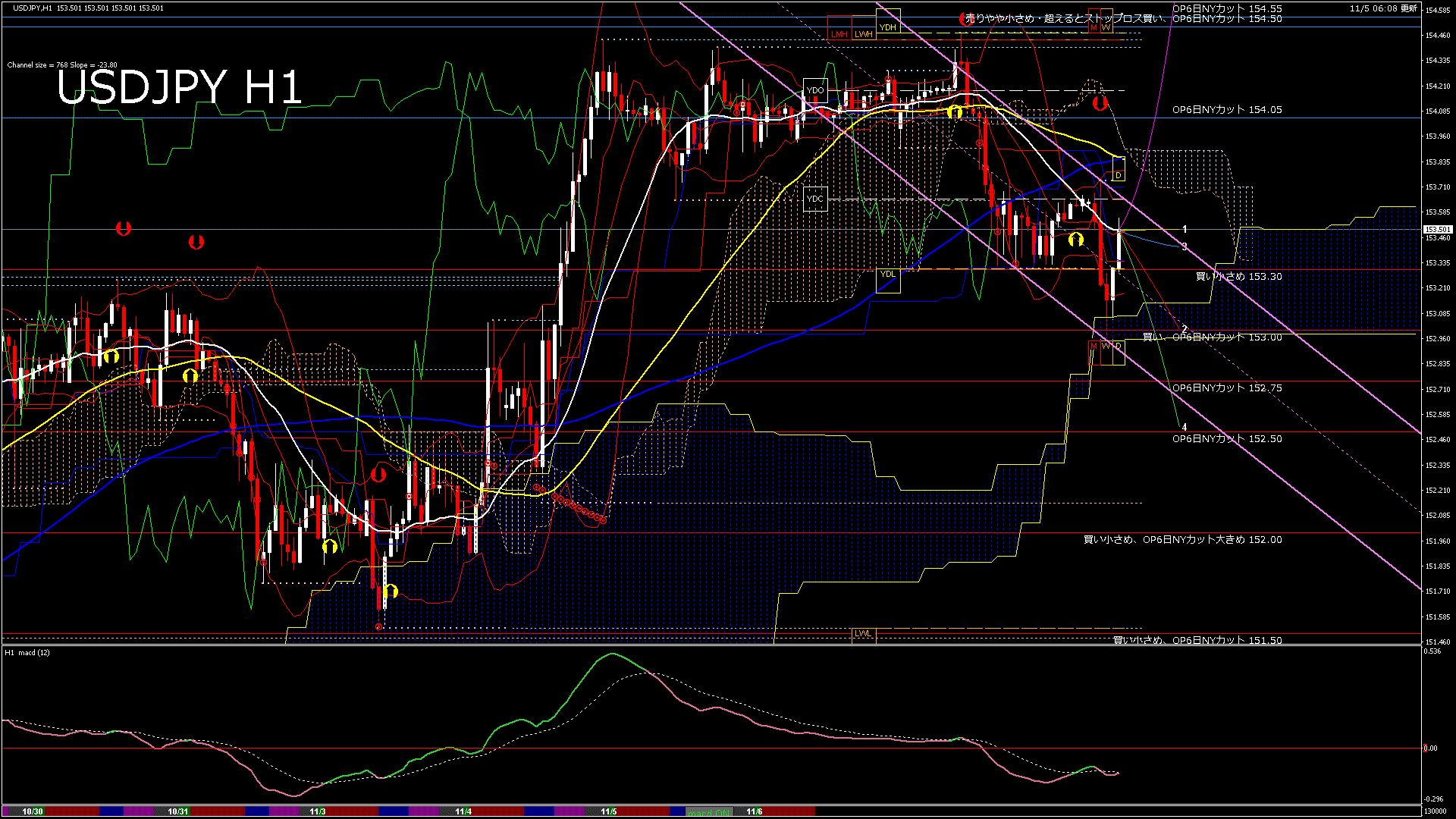 USDJPY-H1移動平均線と現在値(RSI)-2025.11.5 13:00:00