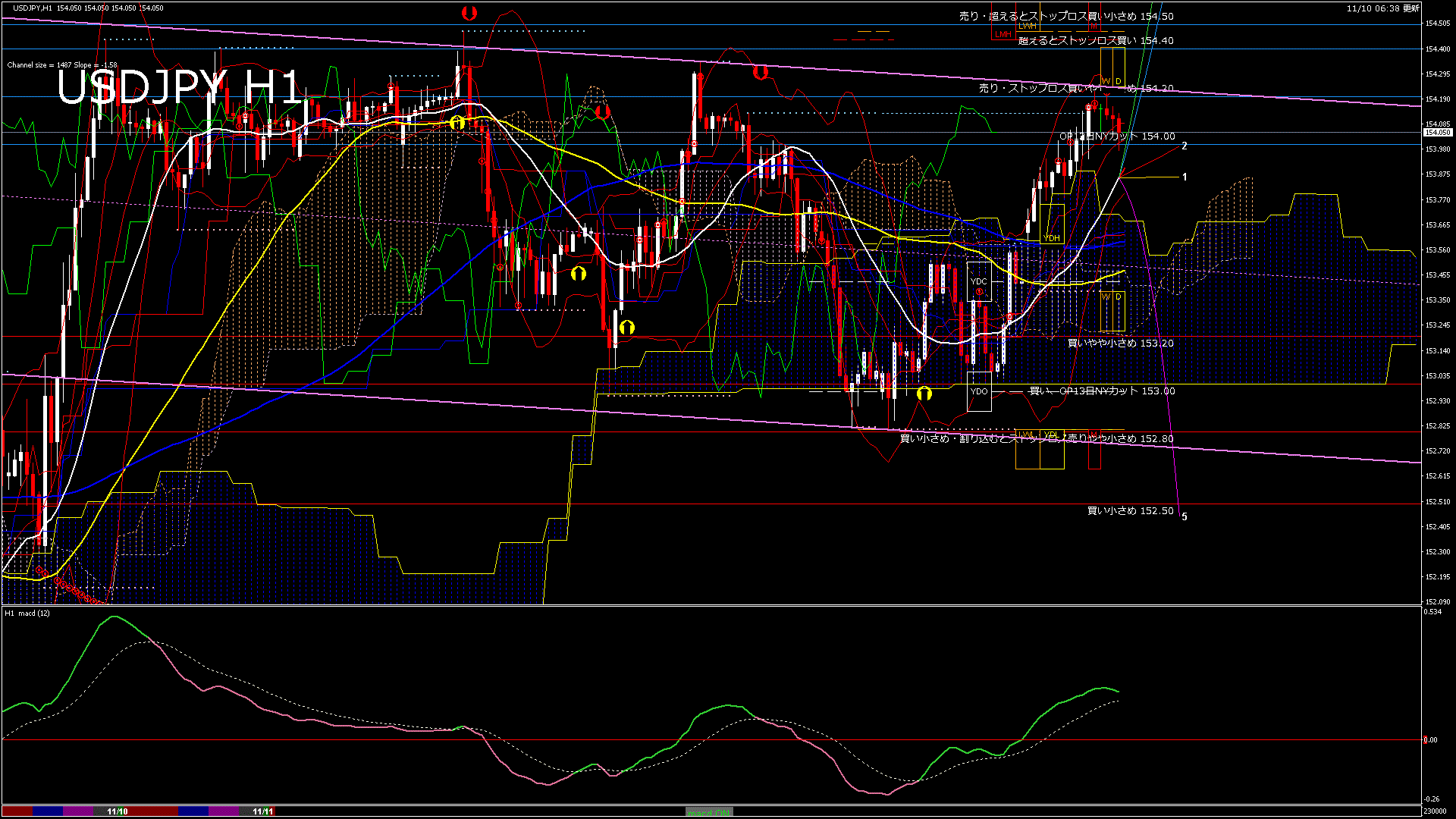 USDJPY-H1移動平均線と現在値(RSI)-2025.11.10 23:00:00