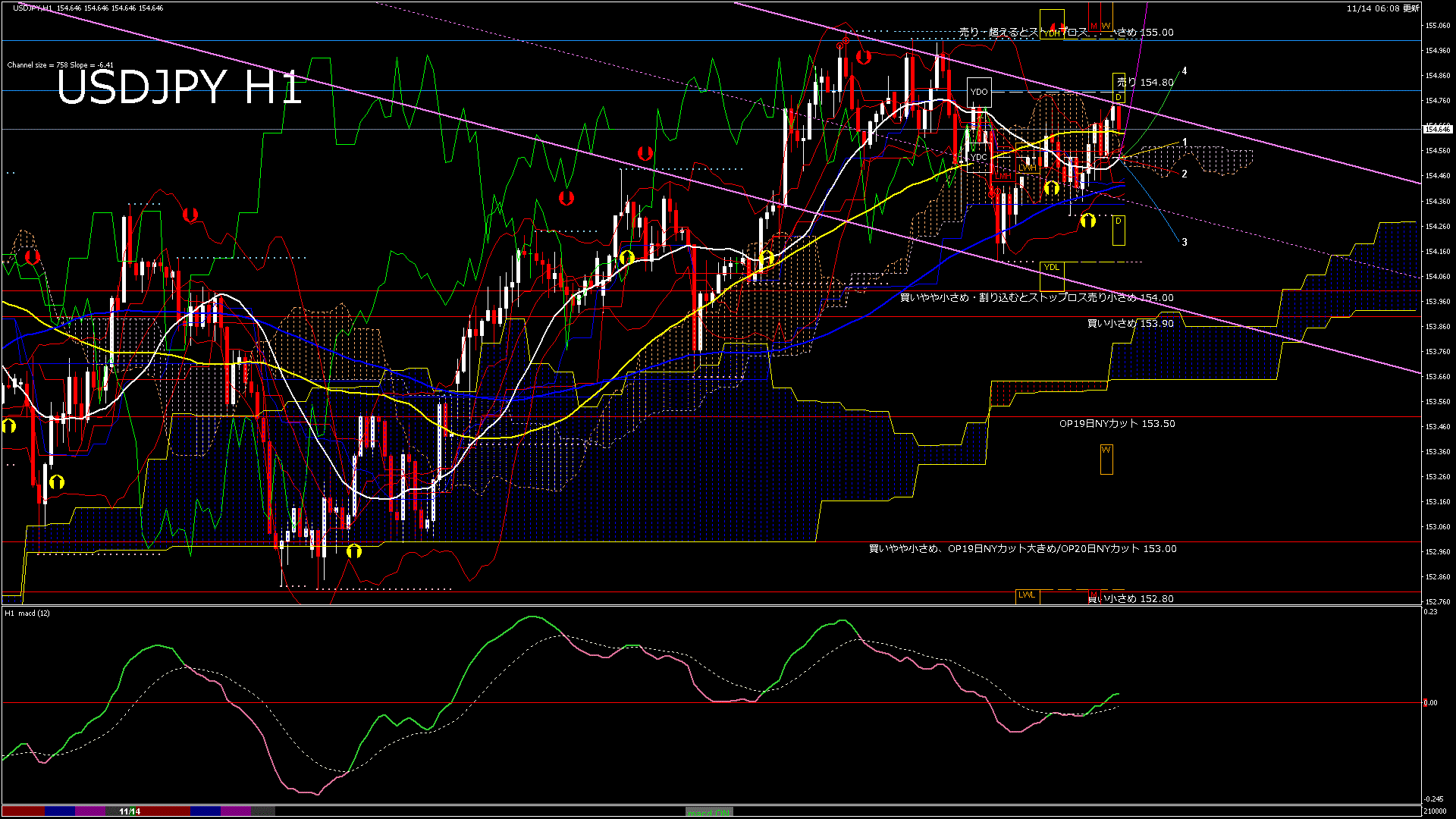 USDJPY-H1移動平均線と現在値(RSI)-2025.11.14 21:00:00