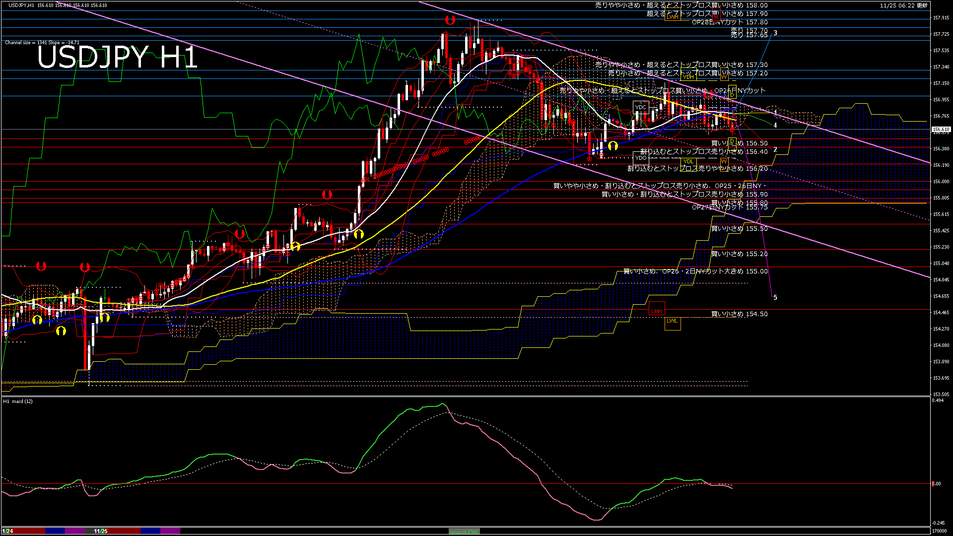 USDJPY-H1移動平均線と現在値(RSI)-2025.11.25 16:00:00