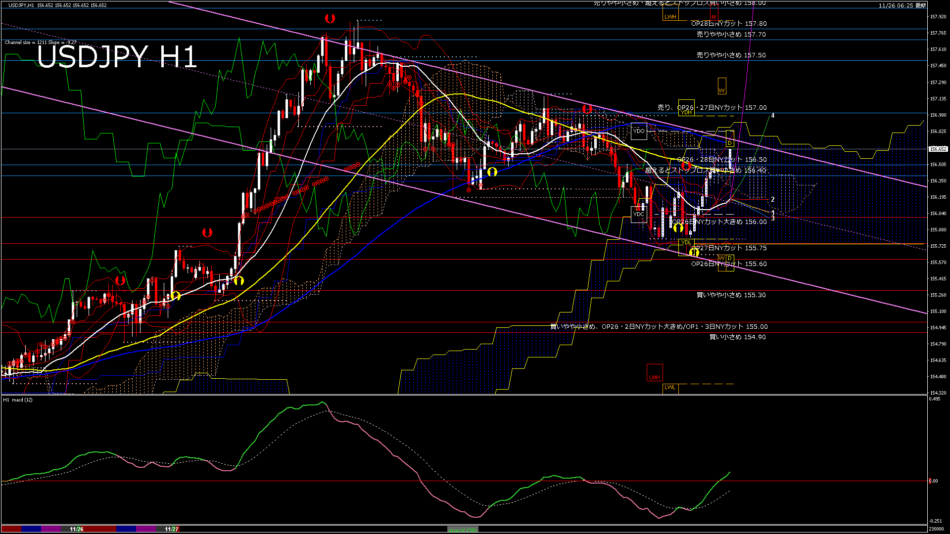 USDJPY-H1移動平均線と現在値(RSI)-2025.11.26 23:00:00