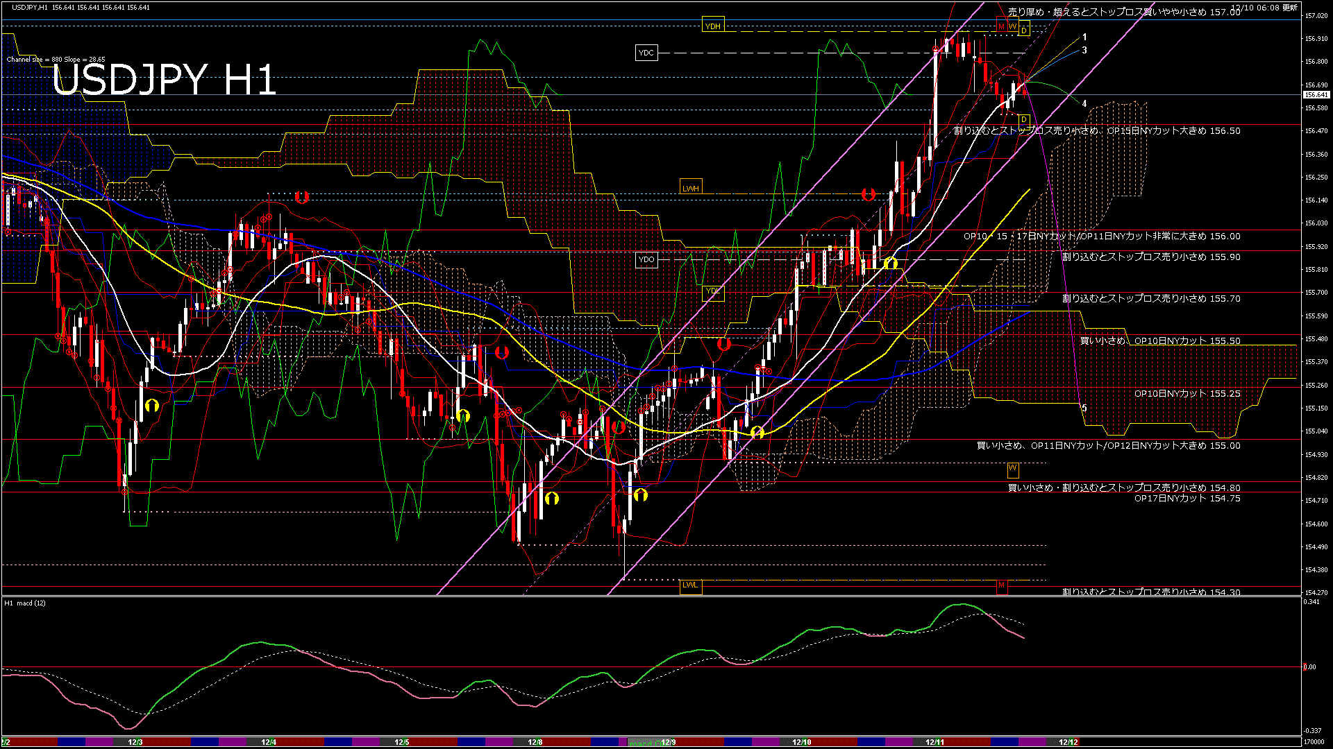 USDJPY-H1移動平均線と現在値(RSI)-2025.12.10 16:00:00