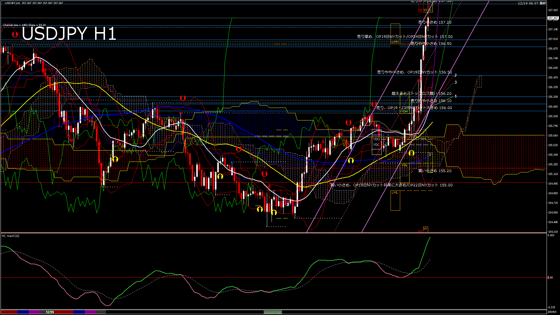 USDJPY-H1移動平均線と現在値(RSI)-2025.12.19 21:00:00