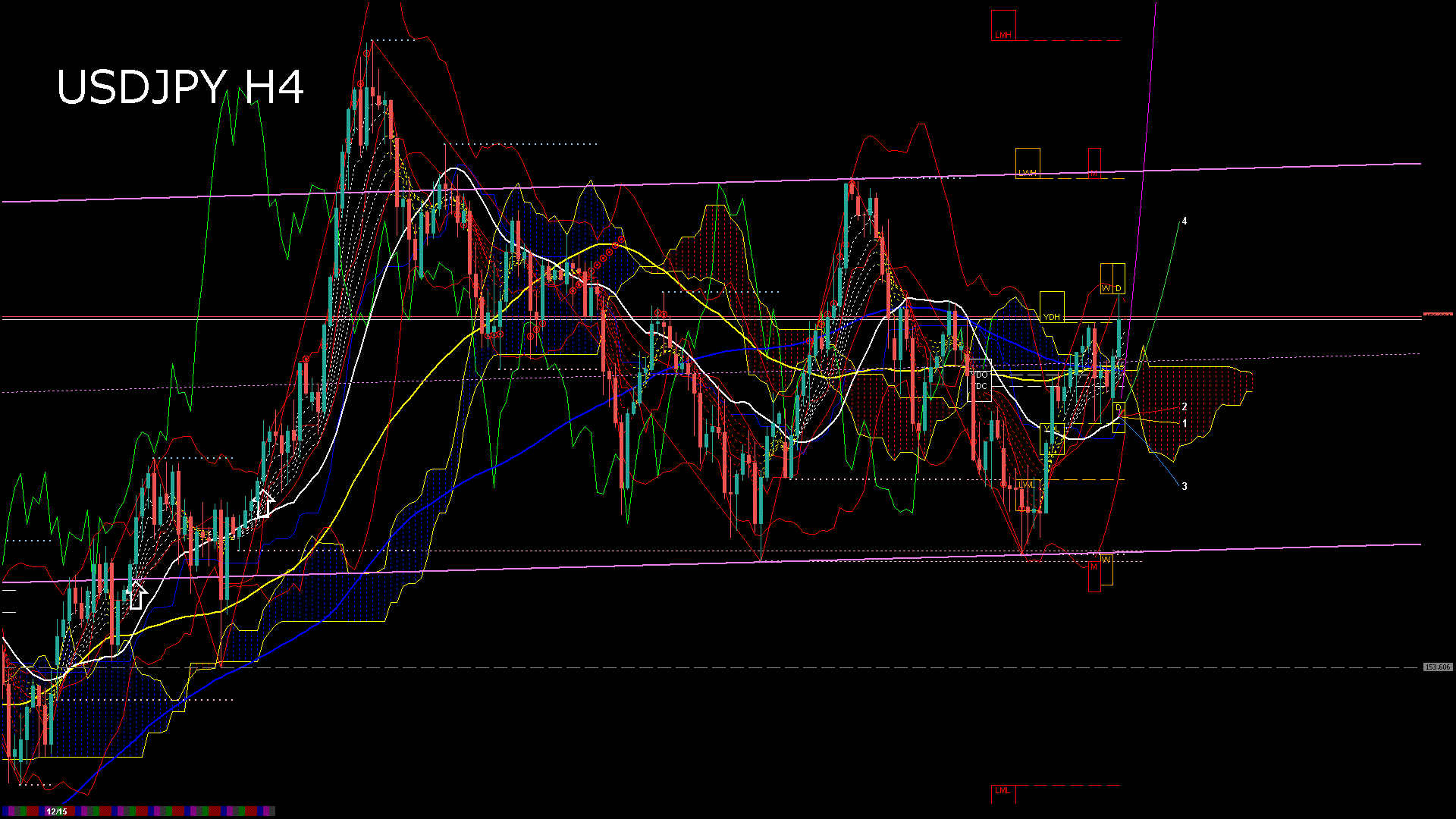 USDJPY-H4移動平均線と現在値(RSI)-2025.12.19 15:00:06