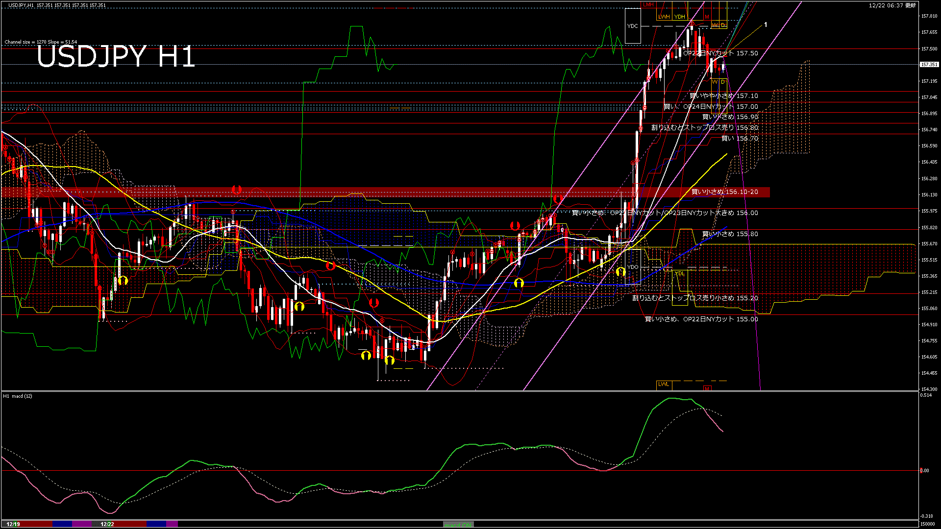 USDJPY-H1移動平均線と現在値(RSI)-2025.12.22 14:00:00