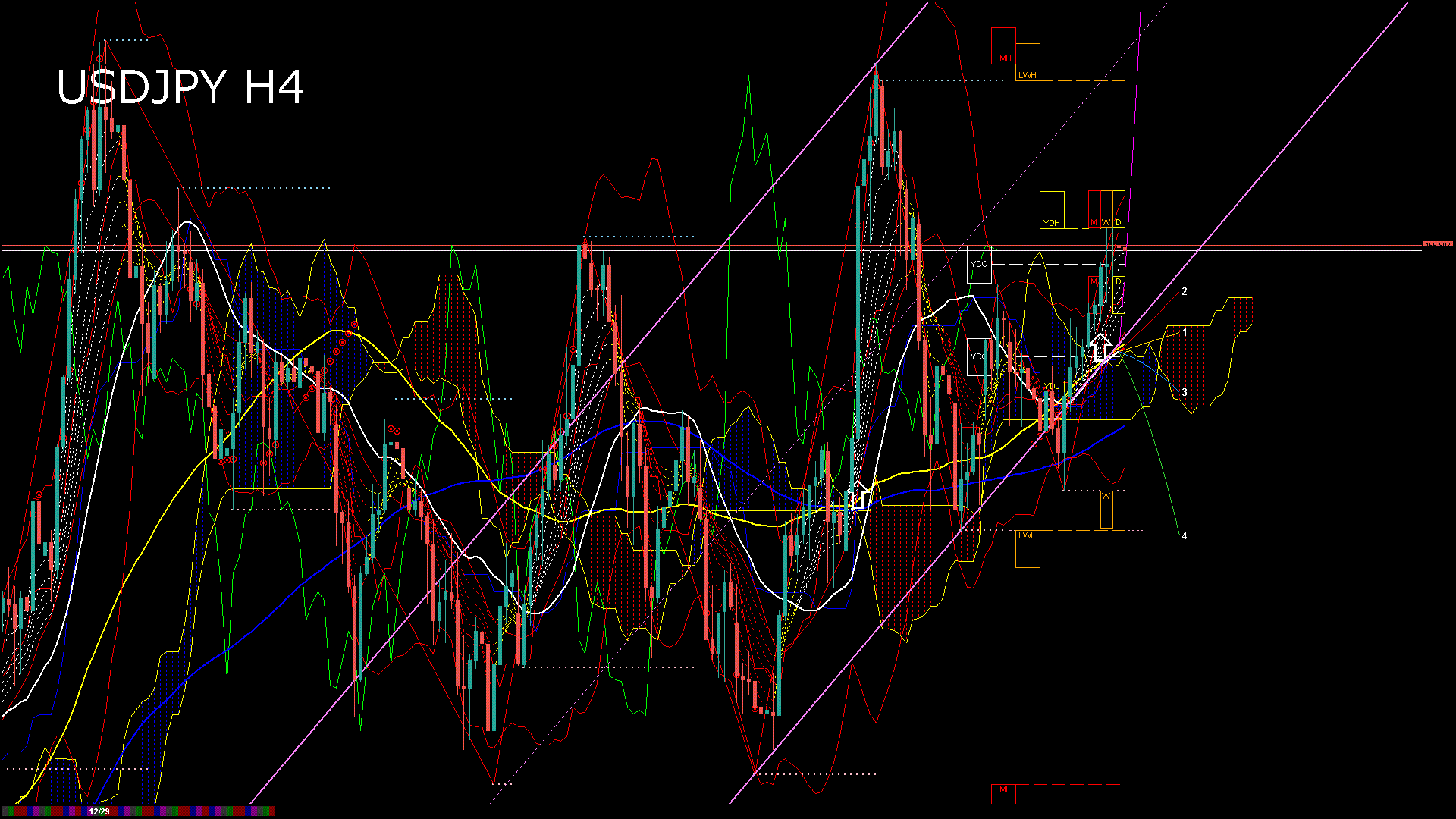 USDJPY-H4移動平均線と現在値(RSI)-2026.1.2 23:00:04