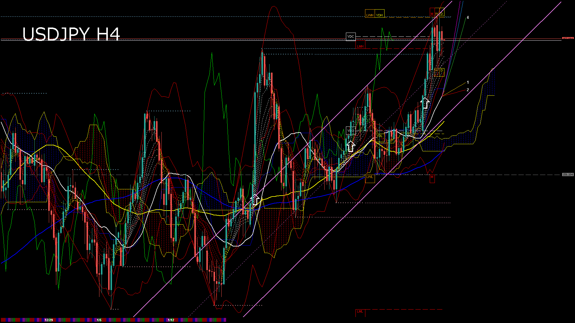 USDJPY-H4移動平均線と現在値(RSI)-2026.1.12 19:00:05