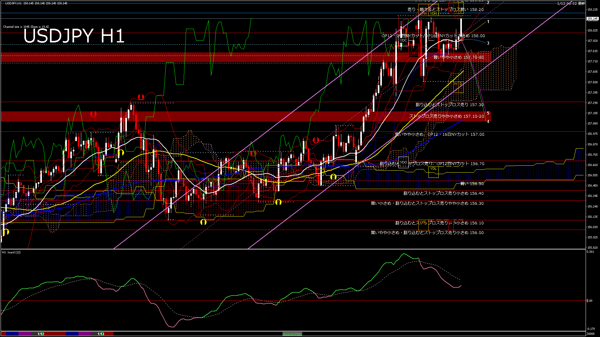 USDJPY-H1移動平均線と現在値(RSI)-2026.1.13 2:00:00
