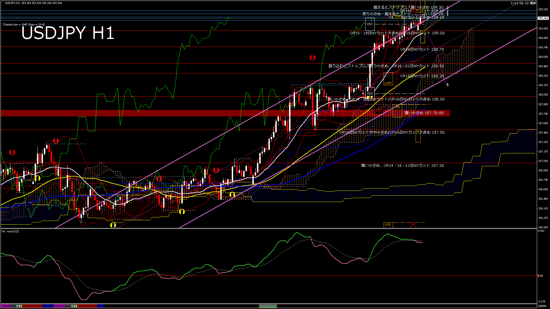 USDJPY-H1移動平均線と現在値(RSI)-2026.1.14 9:00:00