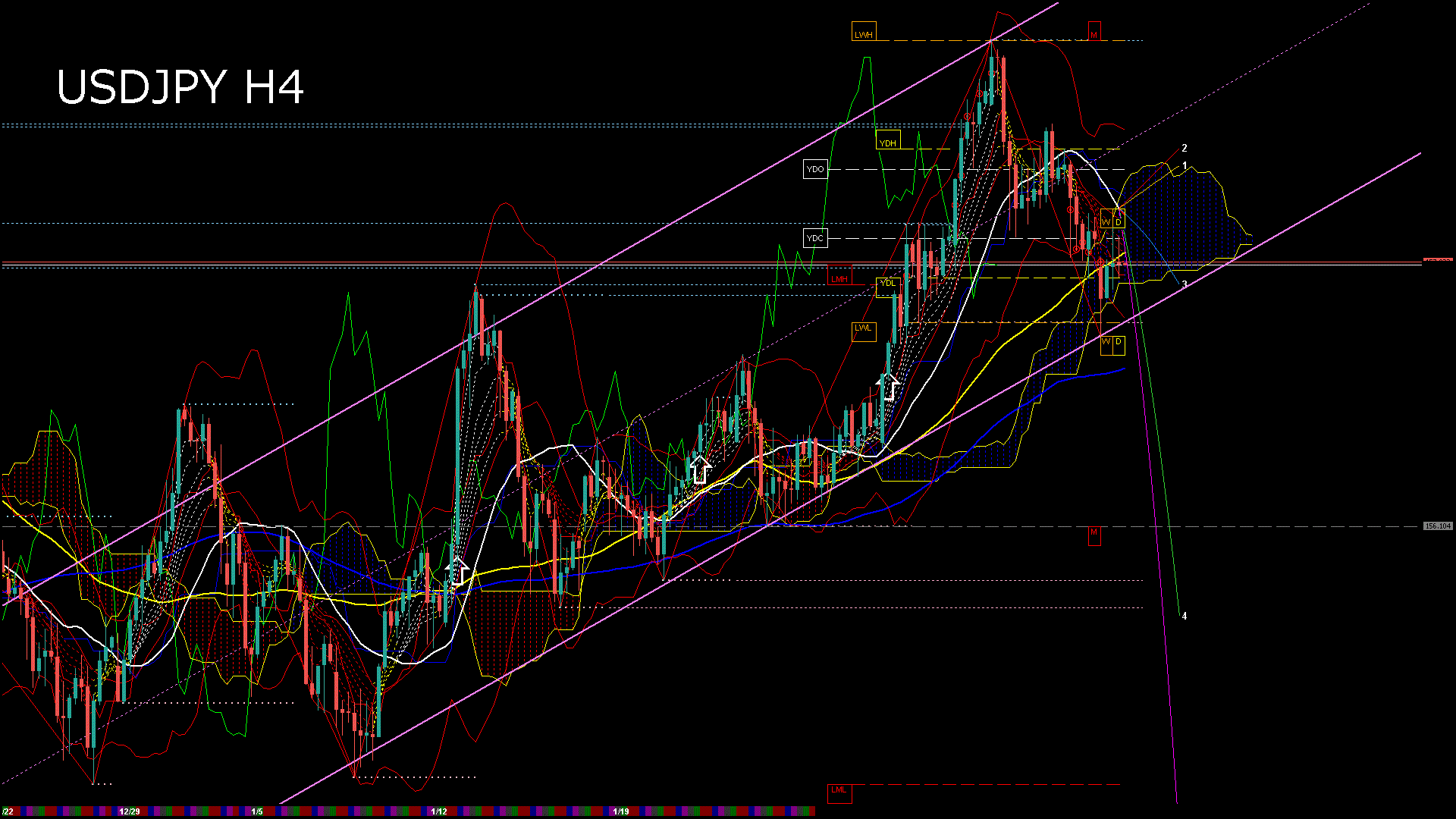 USDJPY-H4移動平均線と現在値(RSI)-2026.1.19 23:00:06