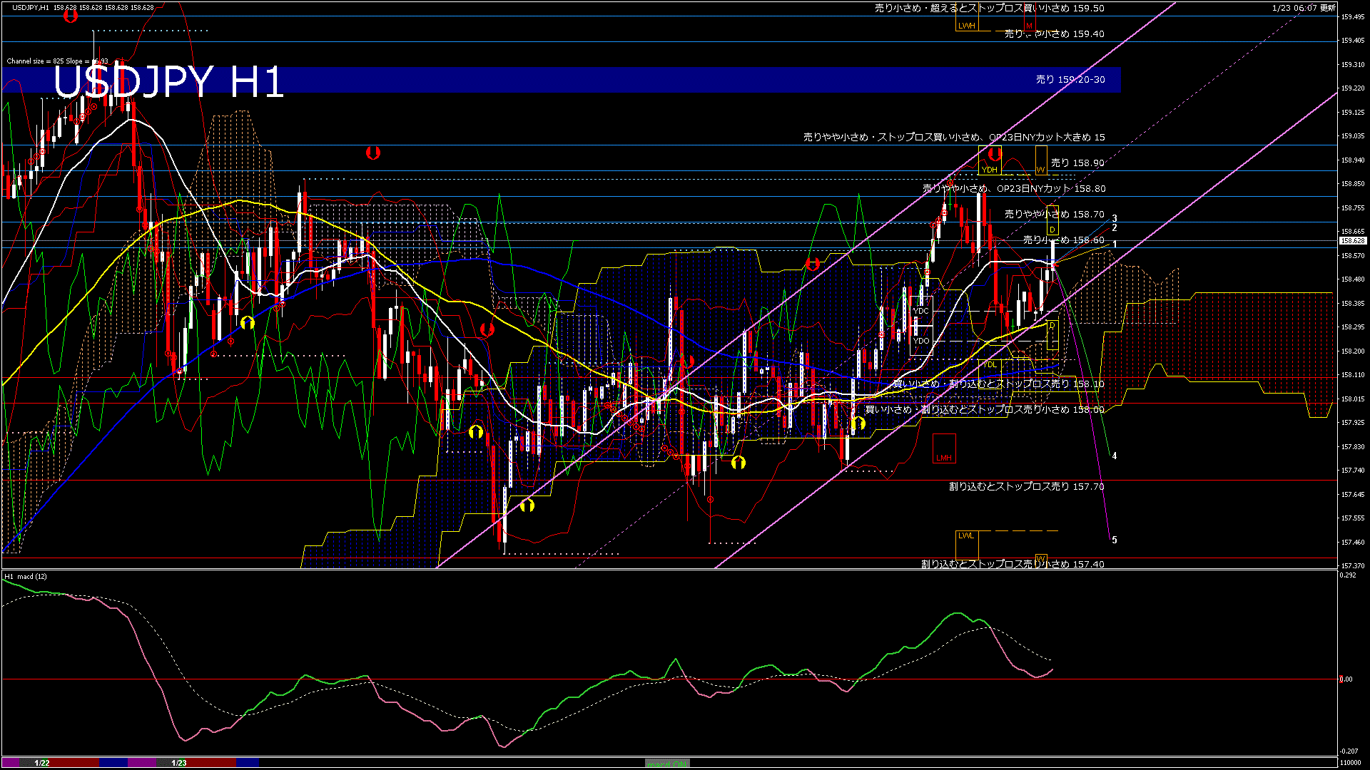 USDJPY-H1移動平均線と現在値(RSI)-2026.1.23 10:00:00