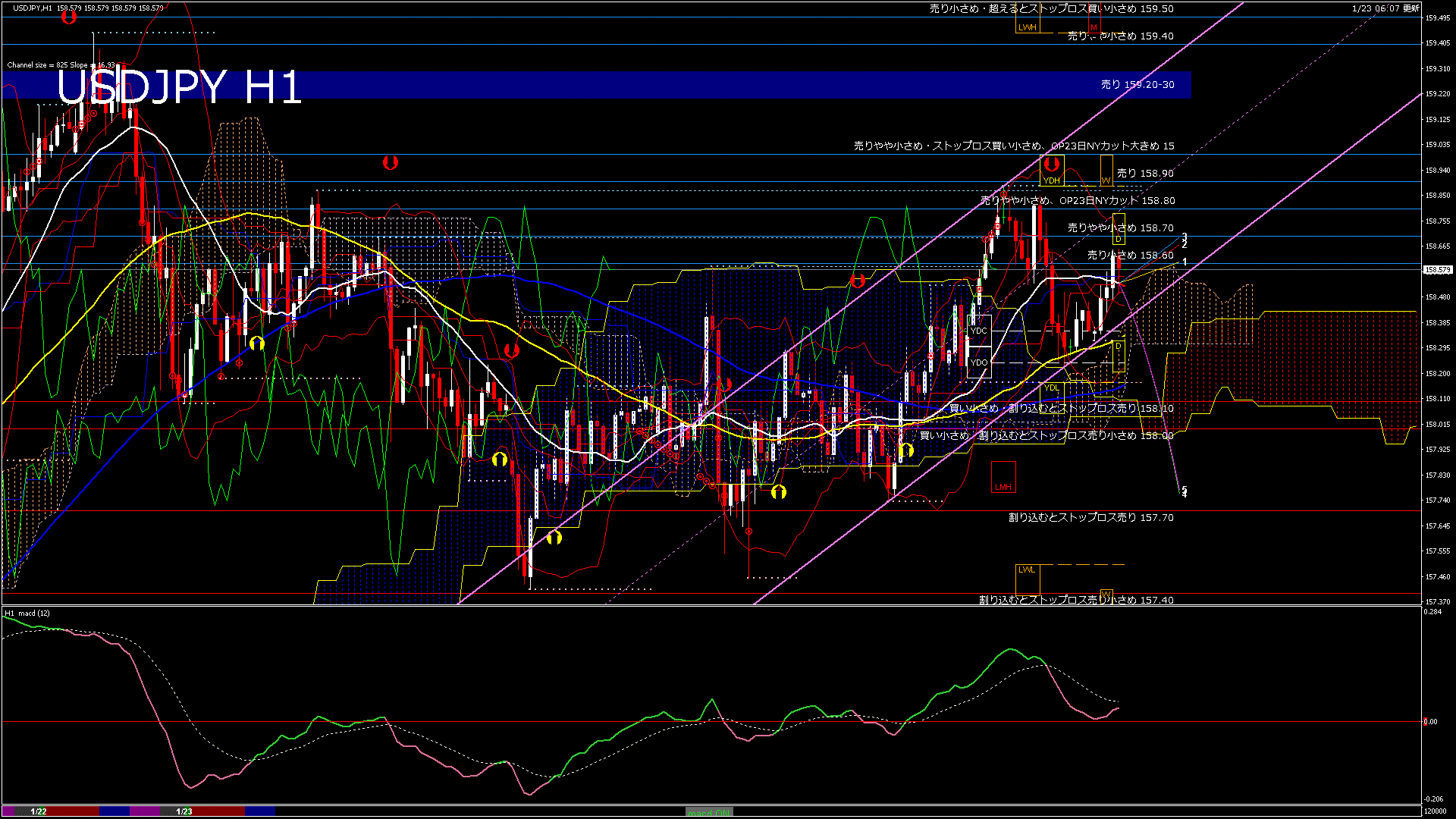 USDJPY-H1移動平均線と現在値(RSI)-2026.1.23 12:00:00