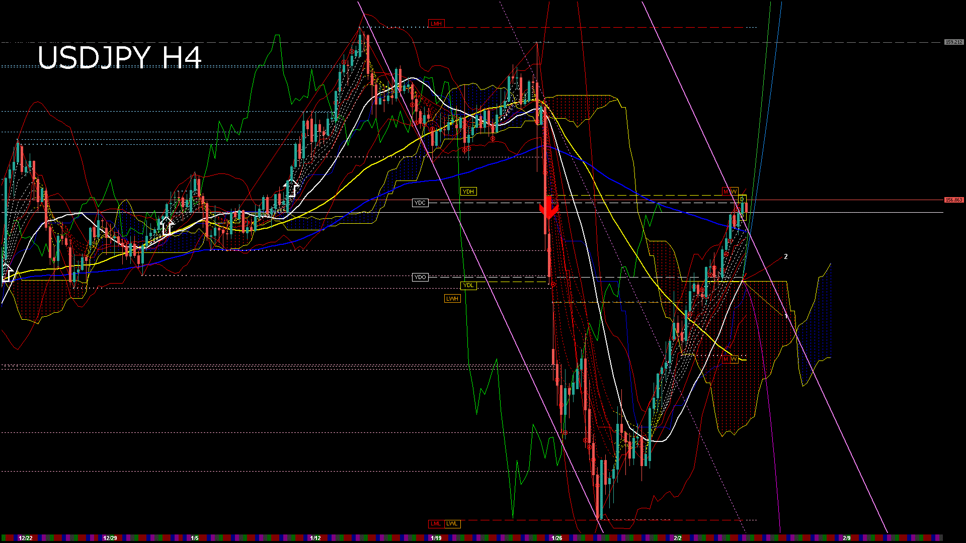 USDJPY-H4移動平均線と現在値(RSI)-2026.2.5 7:00:06