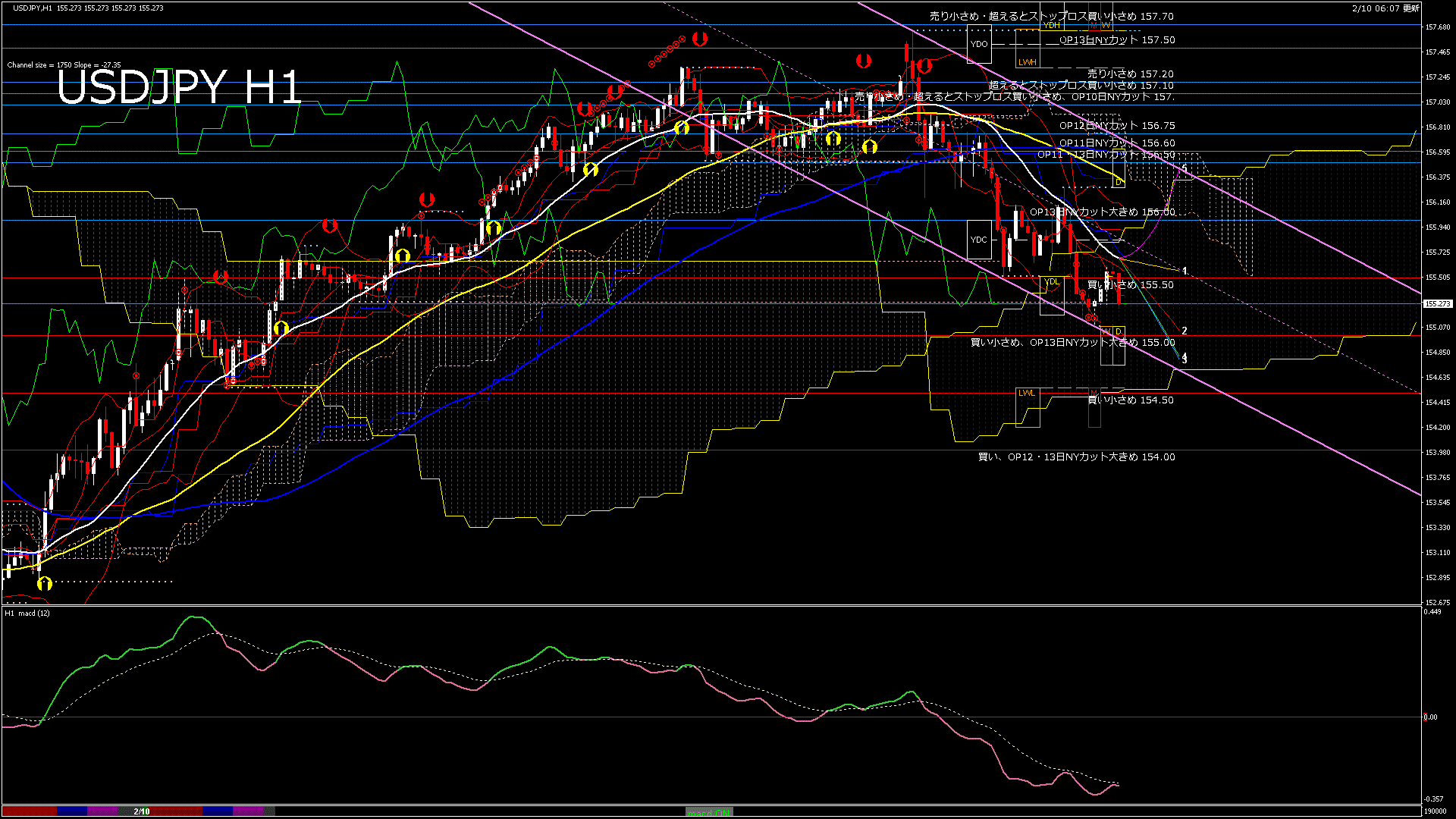 USDJPY-H1移動平均線と現在値(RSI)-2026.2.10 19:00:00