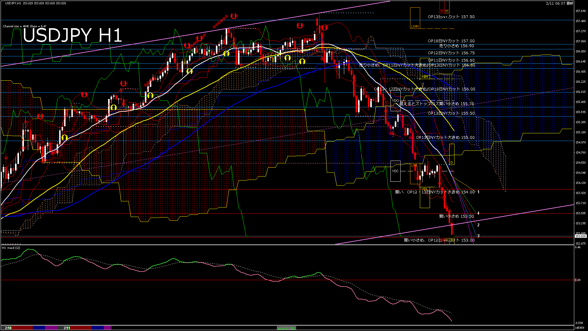 USDJPY-H1移動平均線と現在値(RSI)-2026.2.11 15:00:00