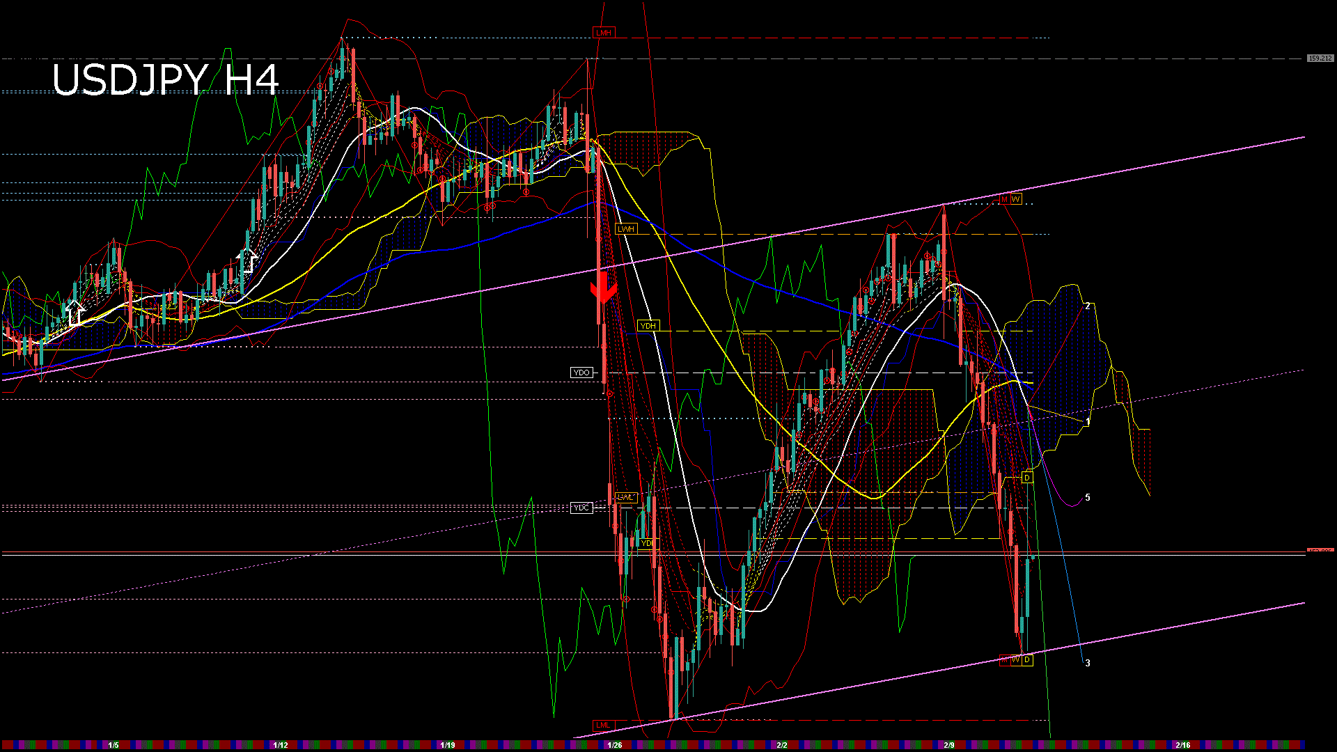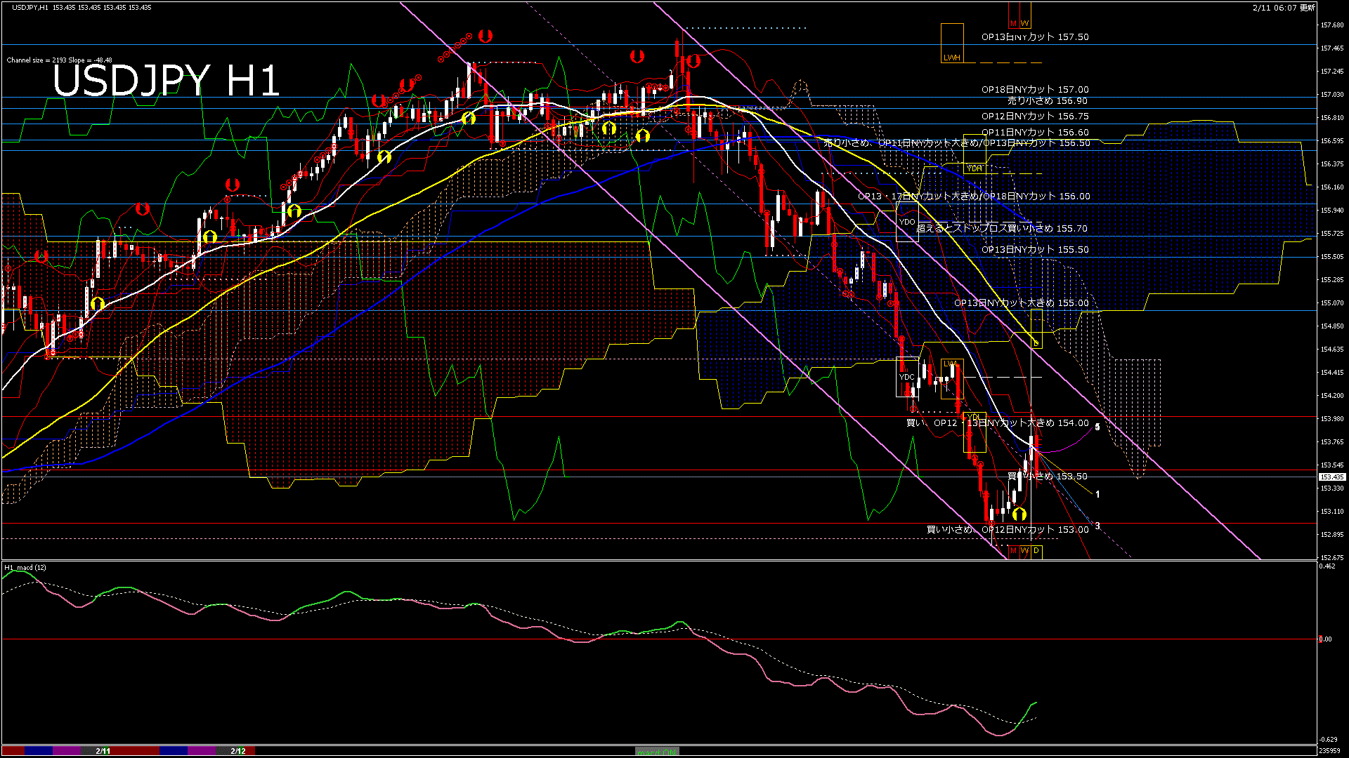 USDJPY-H4移動平均線と現在値(RSI)-2026.2.11 23:00:06