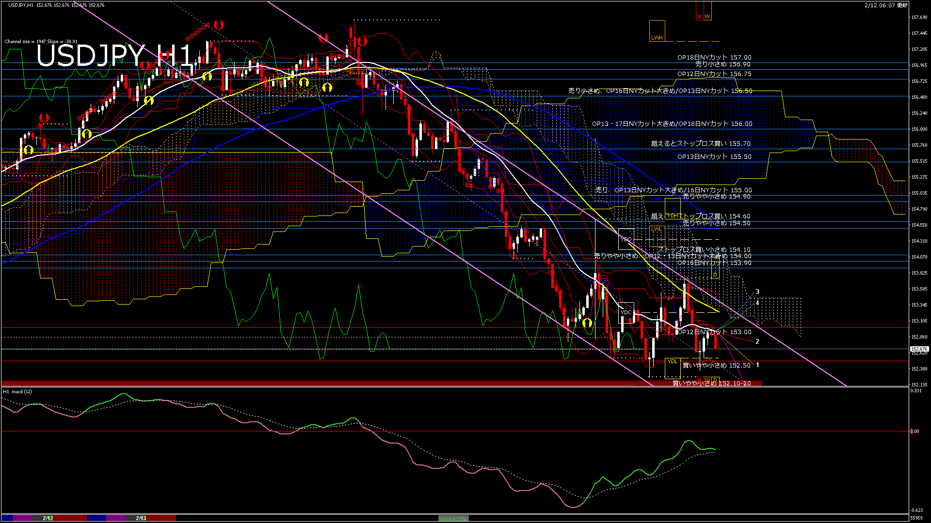 USDJPY-H1移動平均線と現在値(RSI)-2026.2.13 5:00:00