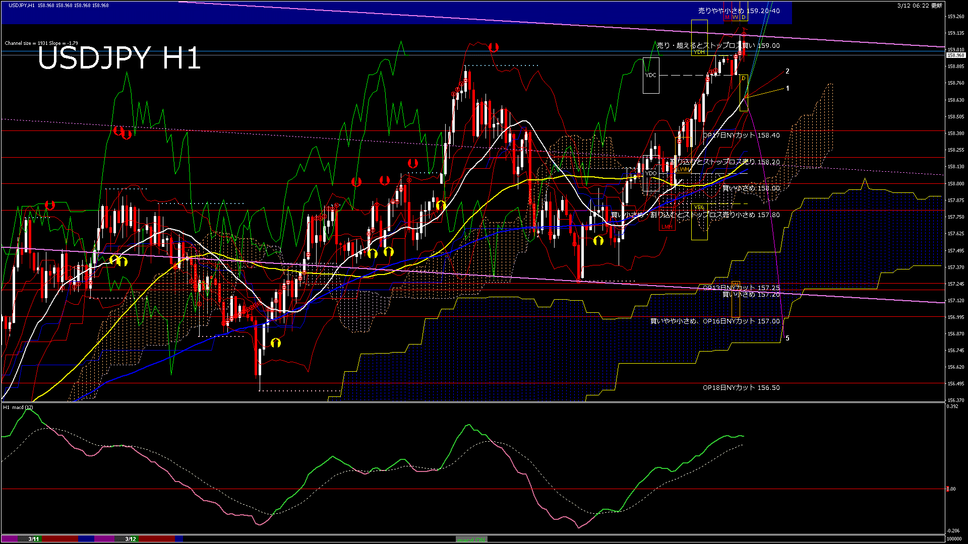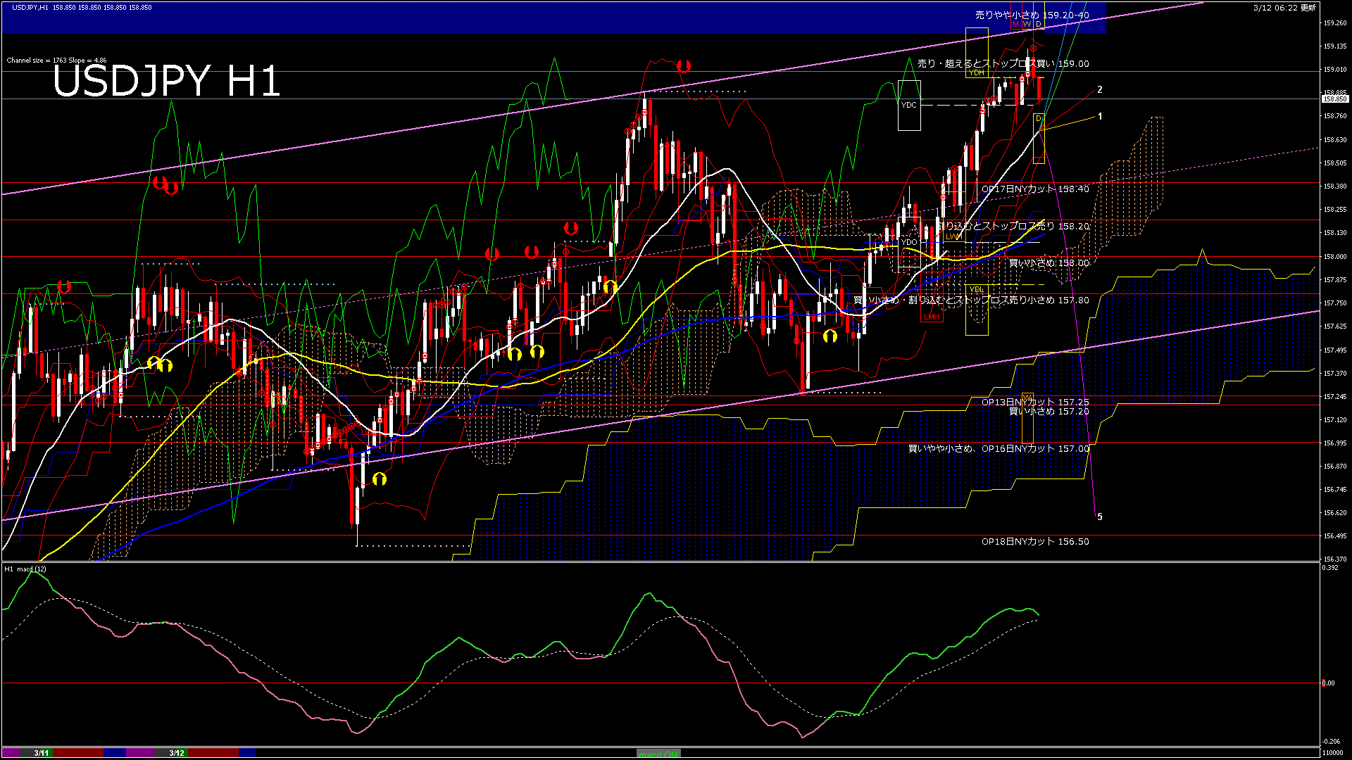 USDJPY-H1移動平均線と現在値(RSI)-2026.3.12 10:00:00