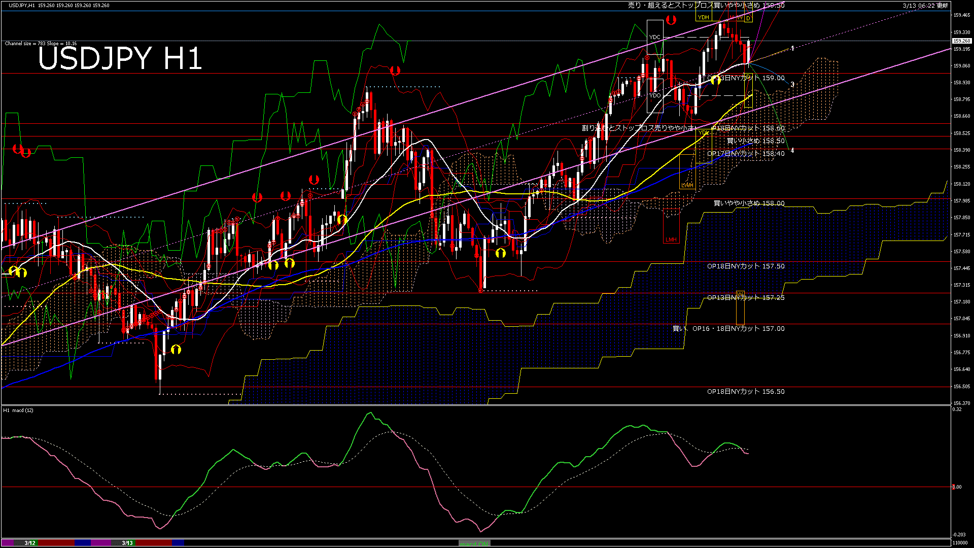 USDJPY-H1移動平均線と現在値(RSI)-2026.3.13 11:00:00