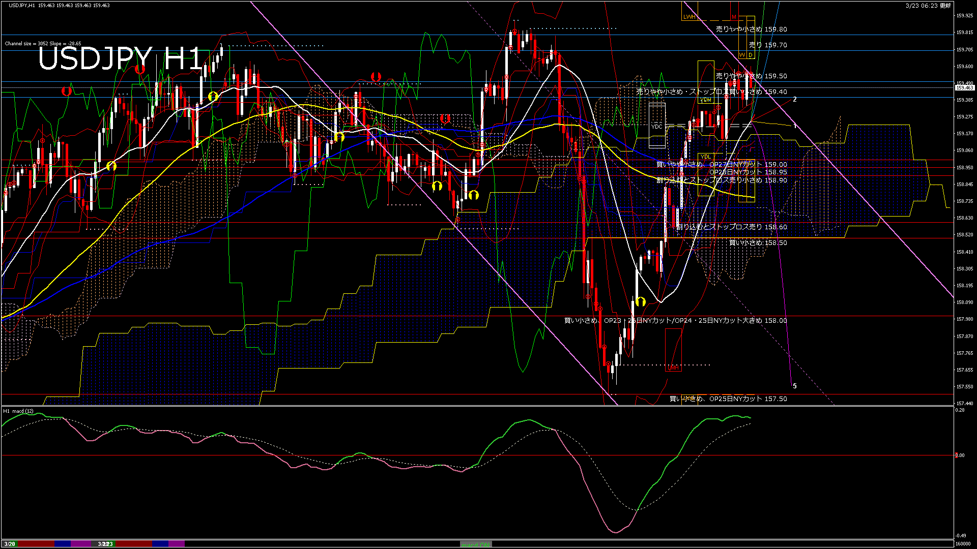 USDJPY-H1移動平均線と現在値(RSI)-2026.3.23 16:00:00