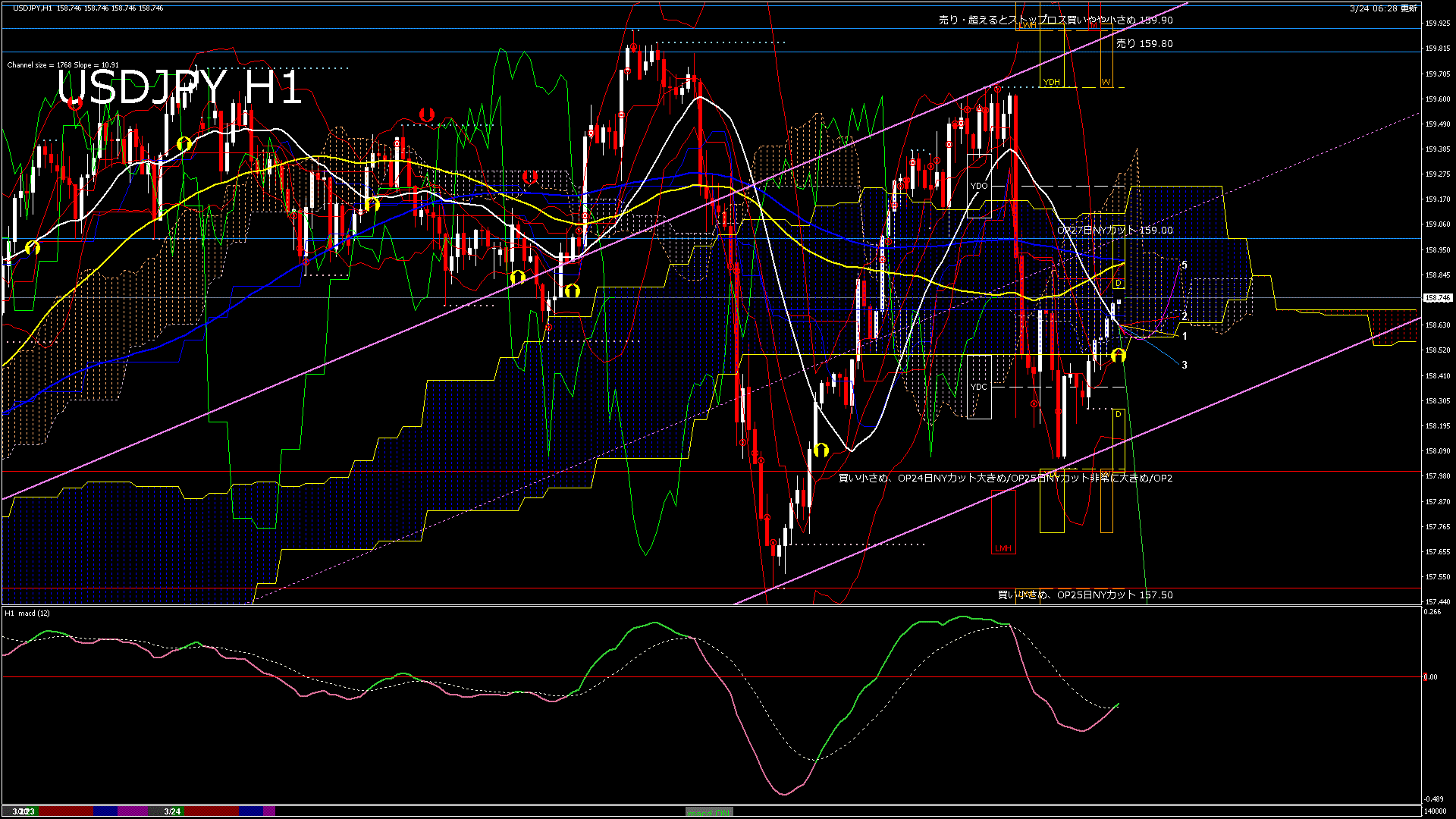 USDJPY-H1移動平均線と現在値(RSI)-2026.3.24 14:00:00