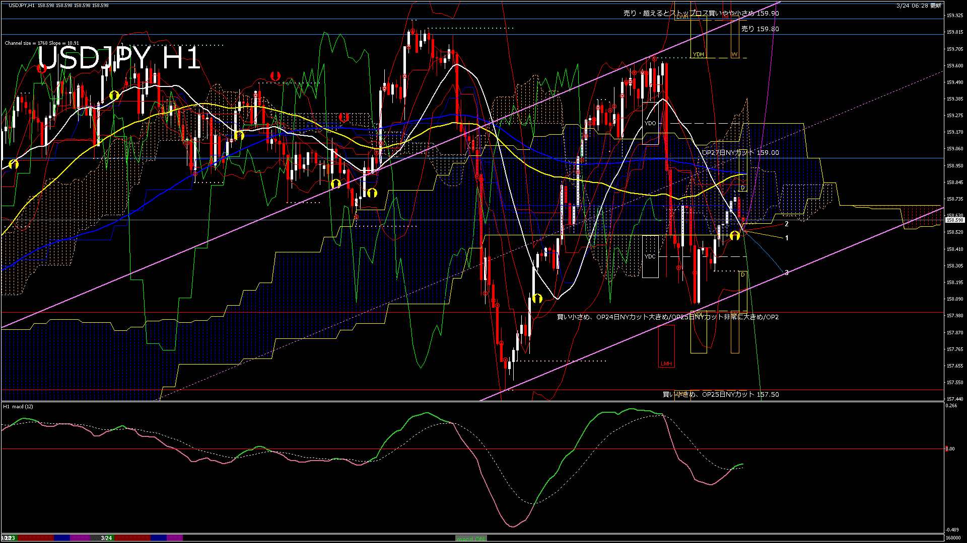 USDJPY-H1移動平均線と現在値(RSI)-2026.3.24 16:00:00