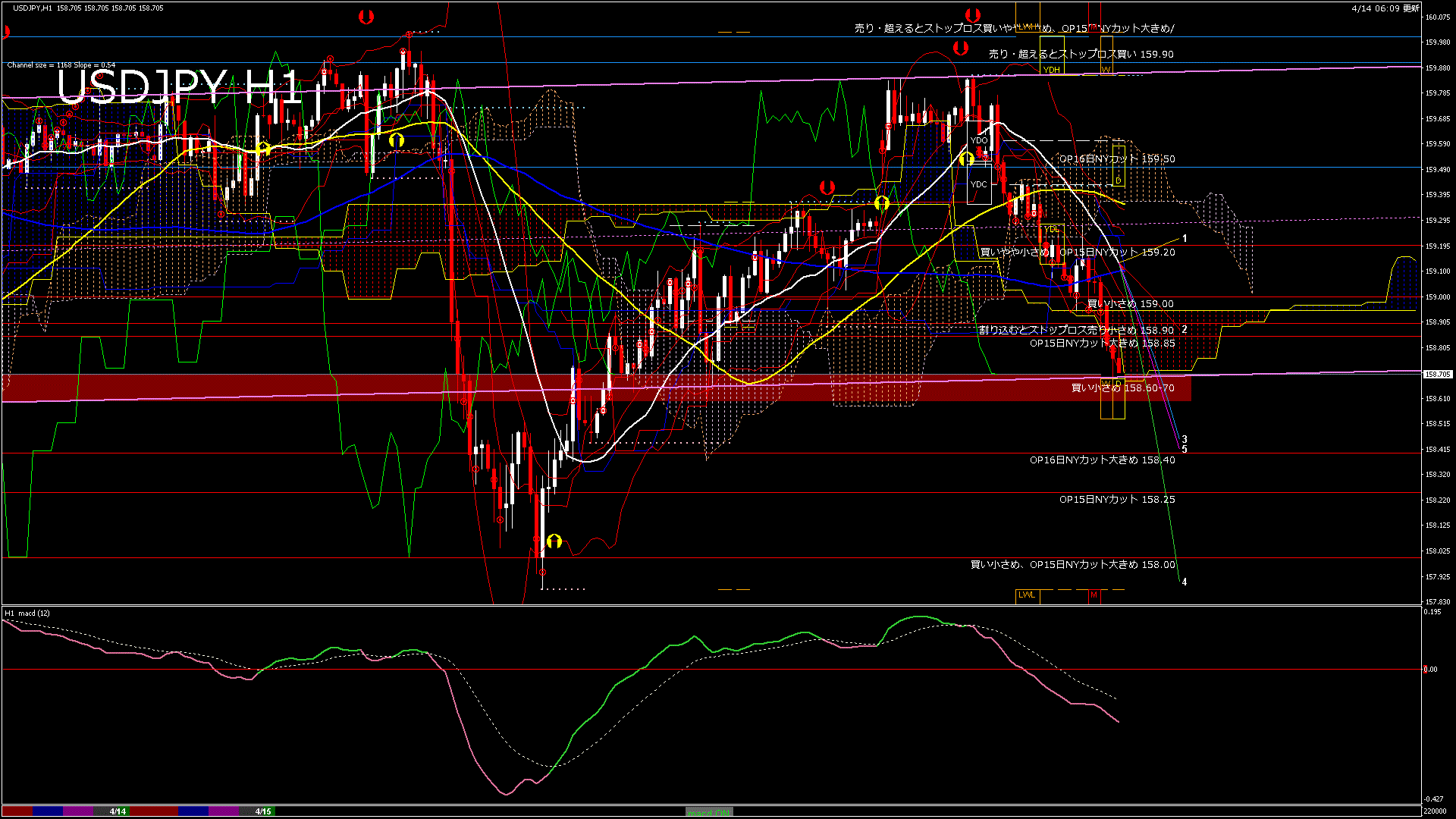 USDJPY-H1移動平均線と現在値(RSI)-2026.4.14 22:00:00